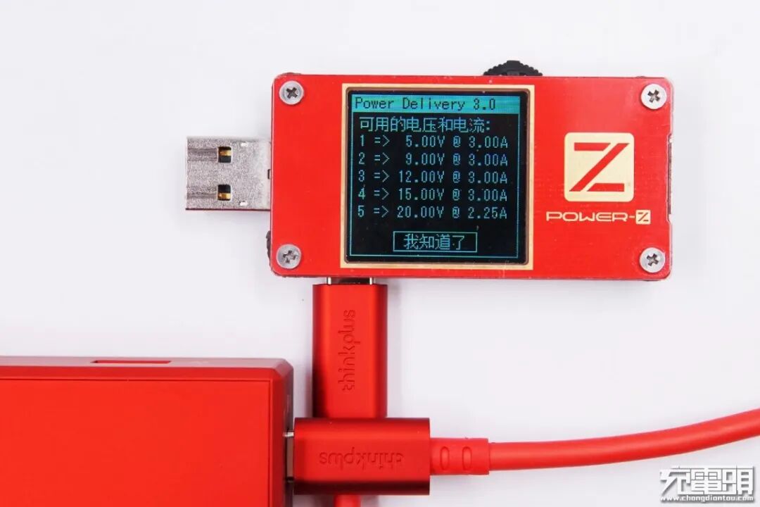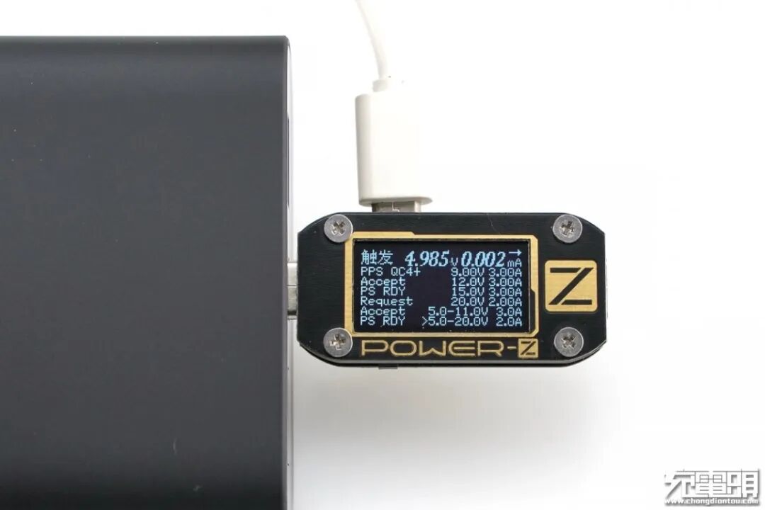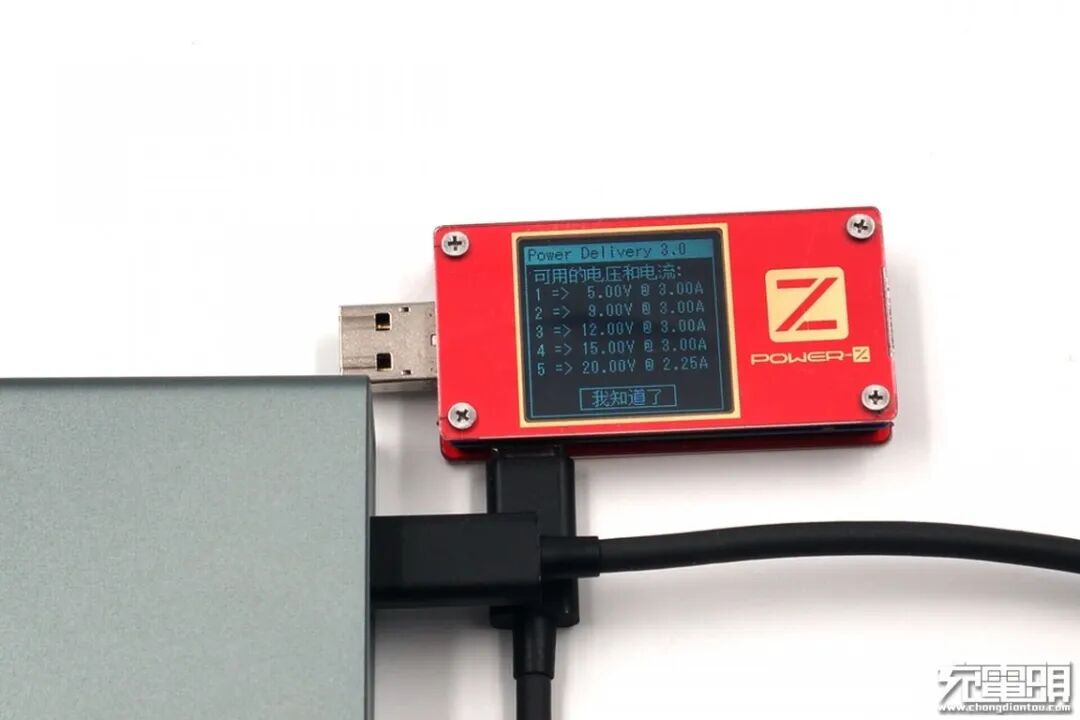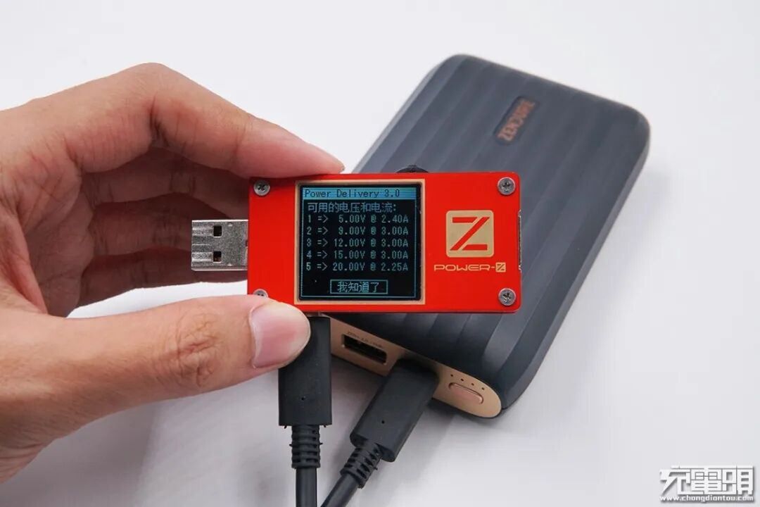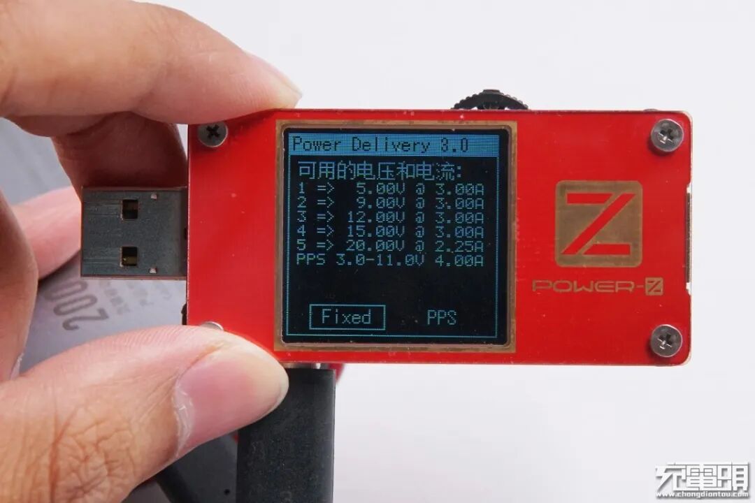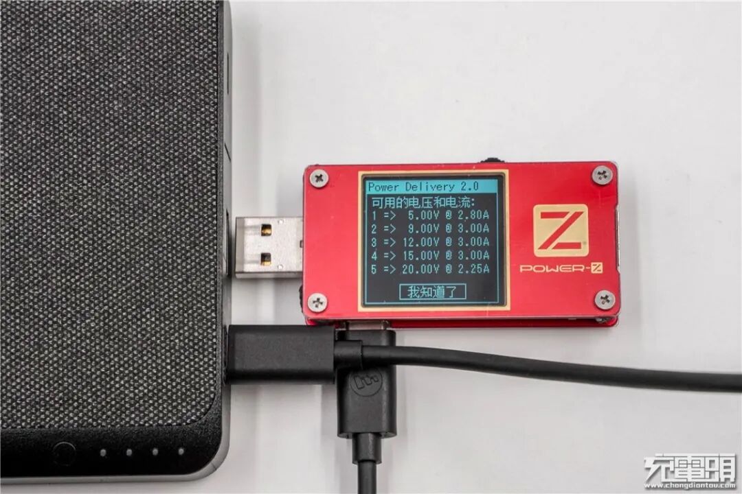 使用ChargerLAB POWER-Z FL001S进行协议测试,USB-C口支持USB PD 2.0协议,共有5V、9V、12V、15V、20V五个输出档位。