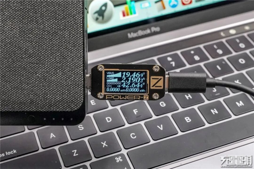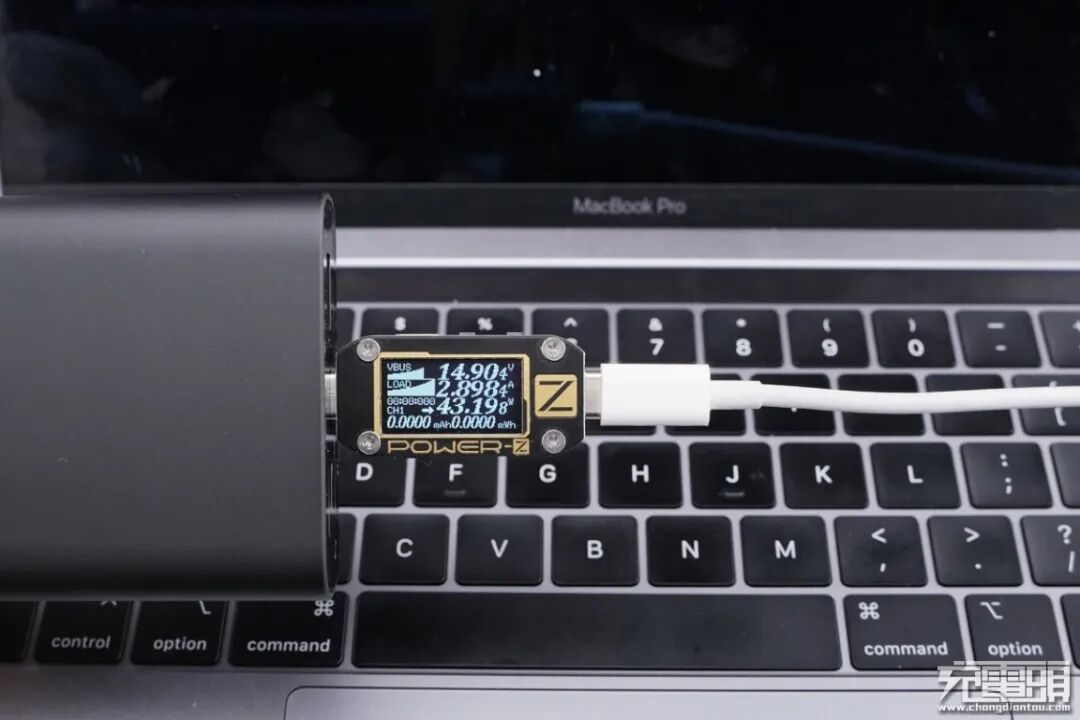 接下来使用USB-C为MacBook Pro 13充电,功率为20.13V 2.14A 43.13W,成功握手20V电压档位,开启PD快充。