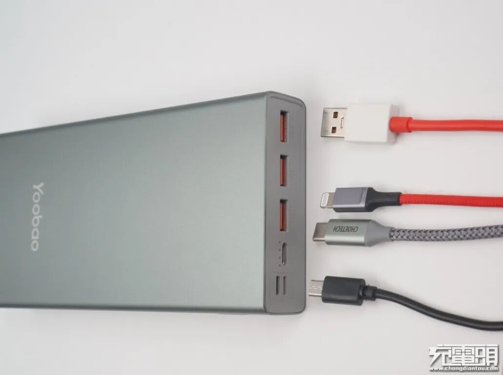 羽博99Wh大容量移动电源,方正的外形设计,拥有非常丰富的输入输出接口。USB-C双向快充接口、Lightning输入接口、MicroUSB输入接口以及三个USB-A输出接口。