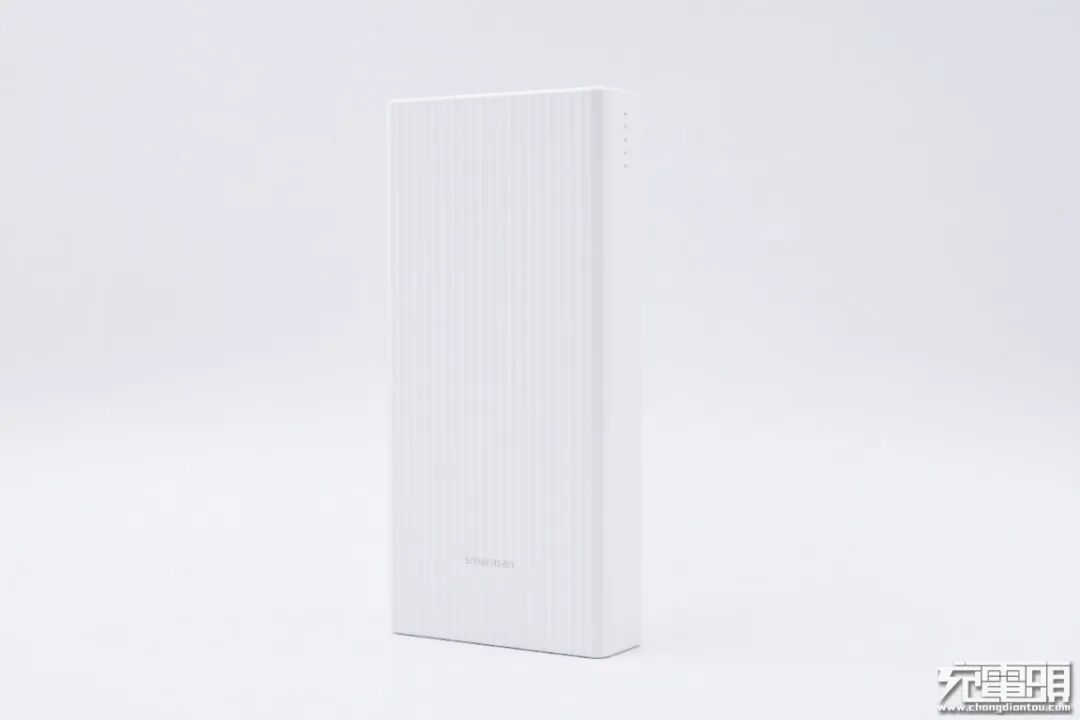 设计方面,锤子45W移动电源整体为白色外观呈现,条纹状的外壳设计,拿在手上可以起到防滑的作用,同时又增加了美观,握手感不错。值得一提的在移动电源侧面带有五个指示灯,其中四个为电量指示灯,亮灯状态为白色;剩下的一个亮灯为绿色,这个指示灯代表着移动电源是否在快充,在为设备快充或者自身快速回血的时候指示灯就会亮起,这样极大的方便了用户判断移动电源在使用的额过程中是否是快充状态。内置20000mAh的电池容量,74Wh的能量即使出门需要坐飞机出行也是可以带在随着携带的,大容量移动电源在身边,出行更放心。