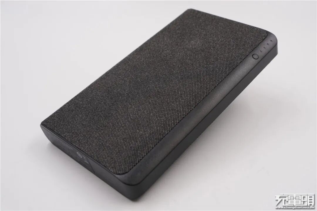 mophie powerstation USB-C 3XL移动电源外形像一本书,使用了塑料外壳并在表面覆盖针织面料。移动电源的手感扎实,做工优秀,外壳与布面贴合,看起来很高端,手感也很舒适。
