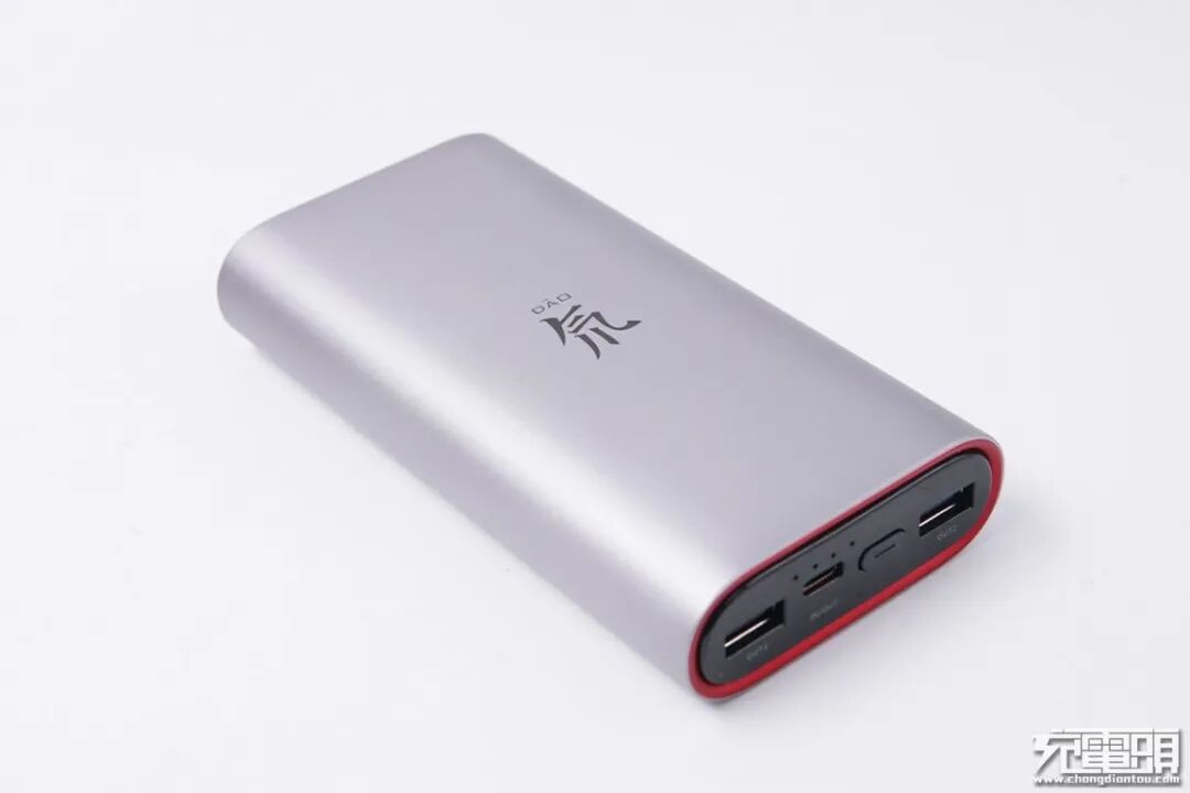 移动电源整体为银灰色外观设计,两侧带有一圈红色的外观点缀,四周采用了过渡的圆滑处理。