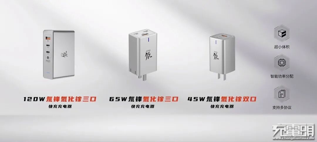 下面是充电头网最关心的事,三款氮化镓充电器,分别是45W 1C1A氮化镓充电器、 65W 2C1A氮化镓充电器和120W 2C1A氮化镓充电器 。氘锋65W 2C1A氮化镓充电器的款式变了,但一样是周冬雨笑脸,其他两款都是新品。