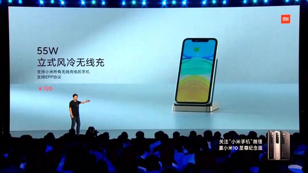 8月11日雷军举行了小米10周年公开演讲,发布了支持120W有线快充50W无线快充的的小米10至尊纪念版,配套的各种配件也同步登场,其中一款产品就是小米55W立式风冷无线充电器。