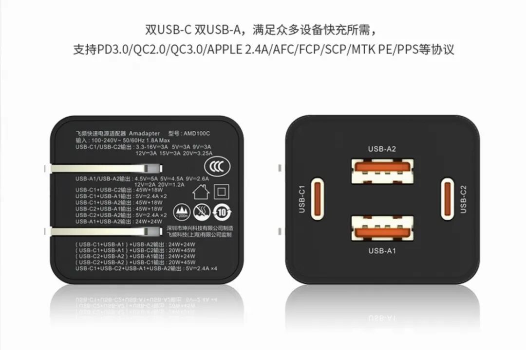 USB-C1/USB-C2支持功率盲插,任意插入均可获得最大65W输出,输出电压包括了5V3A / 9V3A / 12V3A / 15V3A / 20V3.25A五个固定电压,还带有一组PPS3.3-16V3A。USB-A1/USB-A2同样支持功率盲插,任意插入均可获得最大24W输出,输出电压包括了4.5V5A / 5V4.5A / 9V2.6A / 12V2A / 20V1.2A五个固定电压。