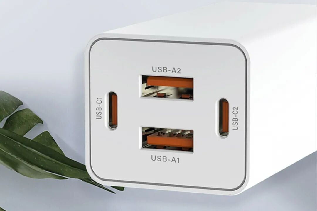 接口方面,飞频四口PD快充充电器拥有2A2C配置,四个输出口呈上下左右对称分布,中间是两个支持多协议的USB-A快充输出口,左右两侧是支持USB PD快充的USB-C快充输出口,全部母座采用橘色舌片器件。