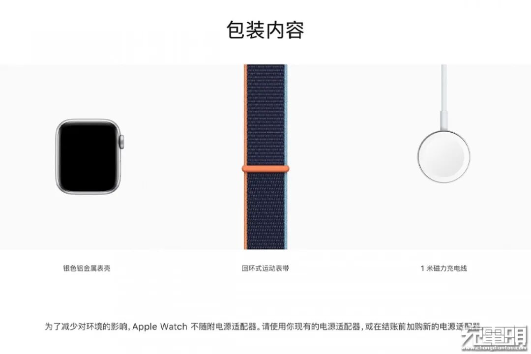 除iPhone以外,Apple Watch全系同样在包装中也不再附带充电器,目前的包装内容当中,除手表本身外,只有一根表带以及一条1米磁力充电线。充电器如有需要,同样要额外单独购买。
