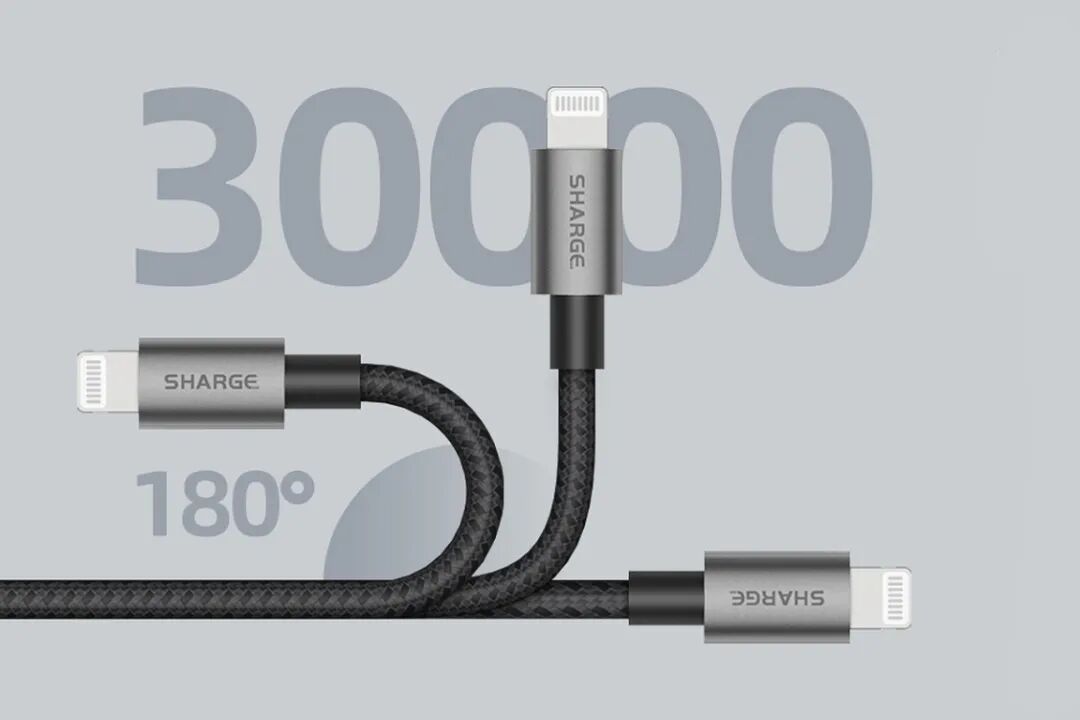 苹果赠送的TPE线缆长久使用很容易脱皮损坏,闪极USB-C to Lightning数据线则采用了耐磨的编织外皮,防弹纤维精密编织通过了30000次180度弯折测试,给予用户长寿耐用保证。