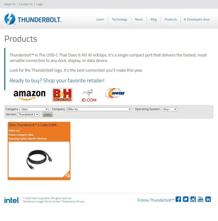 Zikko长期致力于推动雷电超高速数据接口的发展,推出了多款雷电3设备,包括了Zikko雷电3专业Mini拓展坞、Zikko 85W拓展基座评测、Zikko雷电3数据线等等,这次英特尔雷电4首发自然少不了Zikko的参与,在英特尔THUNDERBOLT官网上可以看到雷电4线缆的产品展示,Zikko成为首批获得雷电4认证品牌。