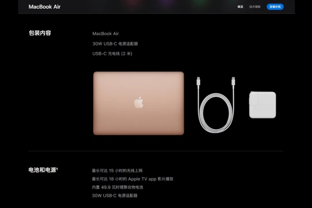 Macbook Air包装内含一根2米长度的USB-C to USB-C充电线,配送的充电器为30W USB-C PD充电器,内置49.9Wh锂聚合物电池,可提供最长15小时的无线上网、18 小时的Apple TV app 影片播放,拥有超长的续航使用时间。