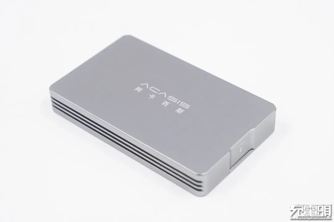 正如包装盒上标注的信息,阿卡西斯的这款USB4.0固态硬盘盒外观为太空灰的配色,盒体整体采用一体铝锭CNC切割而成,喷砂的表面工艺中间印着“ACASIS阿卡西斯”的品牌Logo,整个产品看上去十分精致。