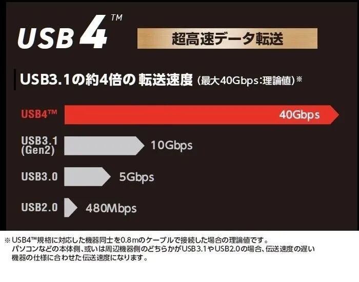 Elecom USB4数据线支持USB4 40传输标准,传输速度八倍于USB3.0达40Gbps,是目前最高速率的线缆,另外还支持100W电力传输,可用于USB PD快速充电,线缆采用三层屏蔽处理提升高速传输稳定性,并采用厚镀金触点抗腐蚀可保持长久使用后的的电气性能,目前Elecom USB4数据线售价5478日元(约合354元人民币)。