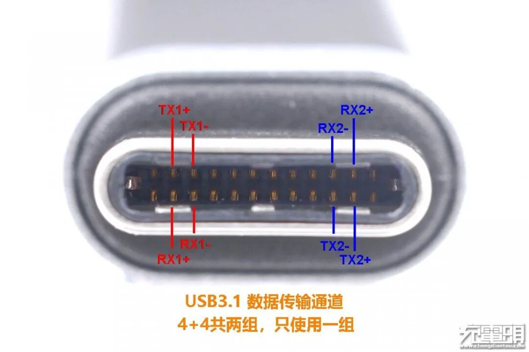 Type-C接口内部包含两组4+4共8根差分信号线(TX1+、TX1-、RX1+、RX1-、TX2+、TX2-、RX2+、RX2-),传输数据时只使用到其中一组,另一组作为备用。