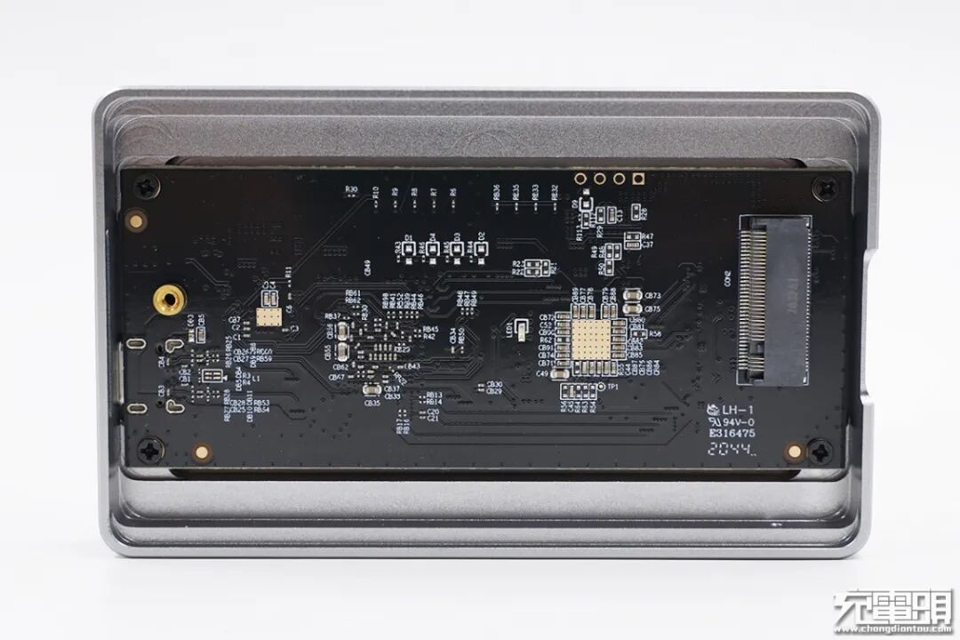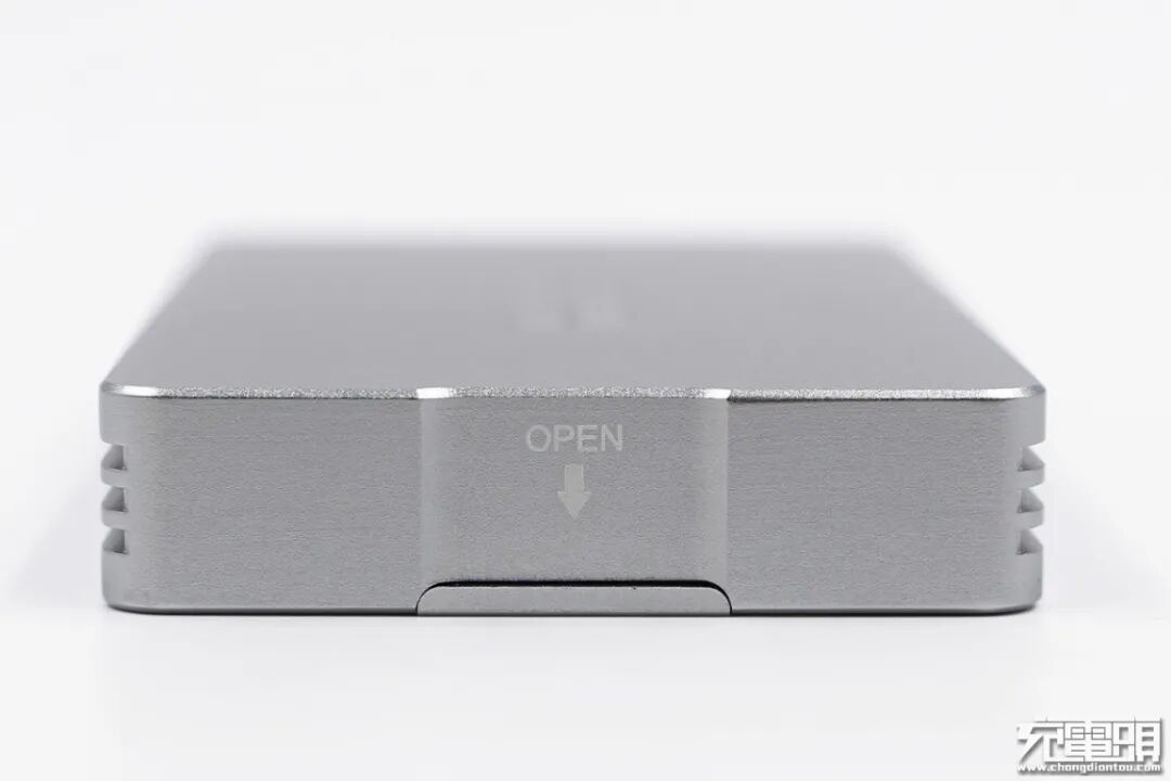 此次的USB4.0硬盘盒并没有采用传统的螺丝固定,而是采用了巧妙的弹力锁定设计来代替螺丝,带来的好处就是可以直接拆装后盖,无需额外的工具,装上后弹力球卡住壳体不松脱。打开硬盘盒也很简单,从侧面的“OPEN”位置直接可以打开不费力。