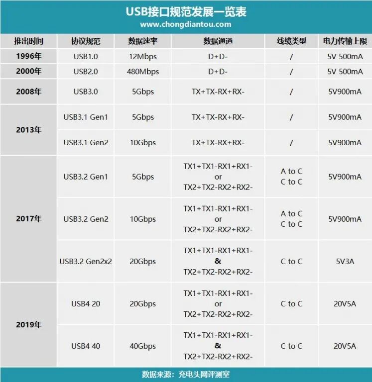1996年USB1.0正式开始正式应用,传输速率为12Mbps,2000年USB2.0协议出台,传输速率大幅度提升至480Mbps,他们均采用D+D-(接口4个触点中间的那两个就是)触点进行数据传输,USB成为使用最广泛的接口一直沿用至今。