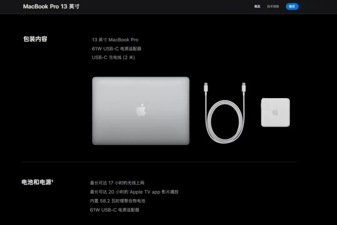 Macbook Pro 13内置58Wh锂聚合物电池,支持10小时无线上网、10小时的Apple TV app影片播放、30天的待机时间,续航能力远超同级水准。包装内容包含一根2米长度的USB-C to USB-C充电线,标配61W USB-C PD充电器。