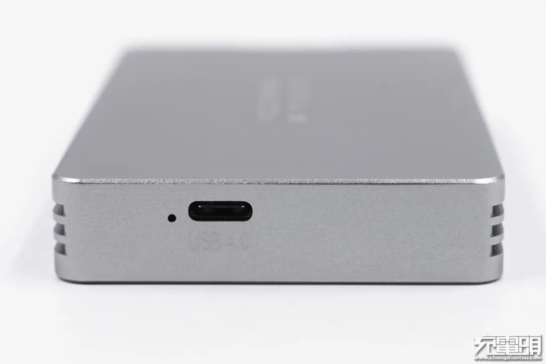 接口方面,硬盘盒采用单USB-C物理接口,左侧辅以一个小圆形的通电指示灯,接口的下面的还带有USB4.0的字样,这也是这款产品最大的特色。