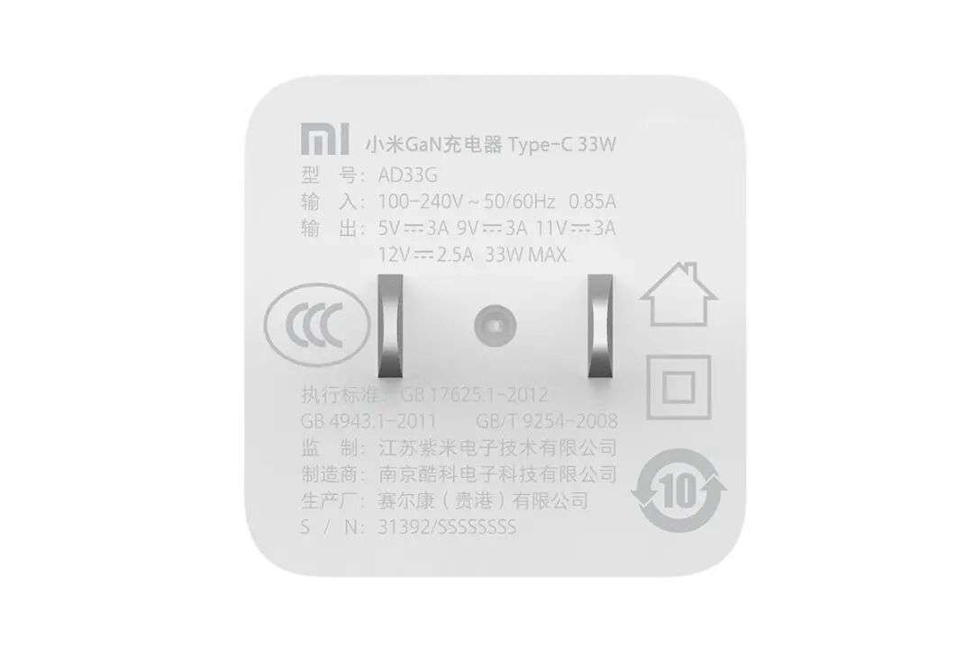 小米33W迷你氮化镓充电器支持USB PD快速充电标准,输出电压除了带有 5V3A,9V3A,12V2.5A三个常见电压档外,还支持11V3A特殊电压输出,这是小米家族私有协议所使用的电压档。充电器制造商为南京酷科电子科技有限公司,生产厂为赛尔康(贵港)有限公司,支持100-240V 50/60Hz 0.85A全球电网使用。