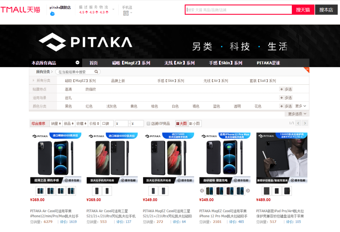 天猫店几乎可以说是PITAKA的主店铺,因为从官网点击购买链接,一样会跳转到天猫店铺。“描述:4.9,服务:4.9,物流4.9”这三大评分都远超行业水平,根据笔者多年经验,评论和打分都比较真实,既体现在数量与销量一致、也体现在评论是人话且指出缺点。