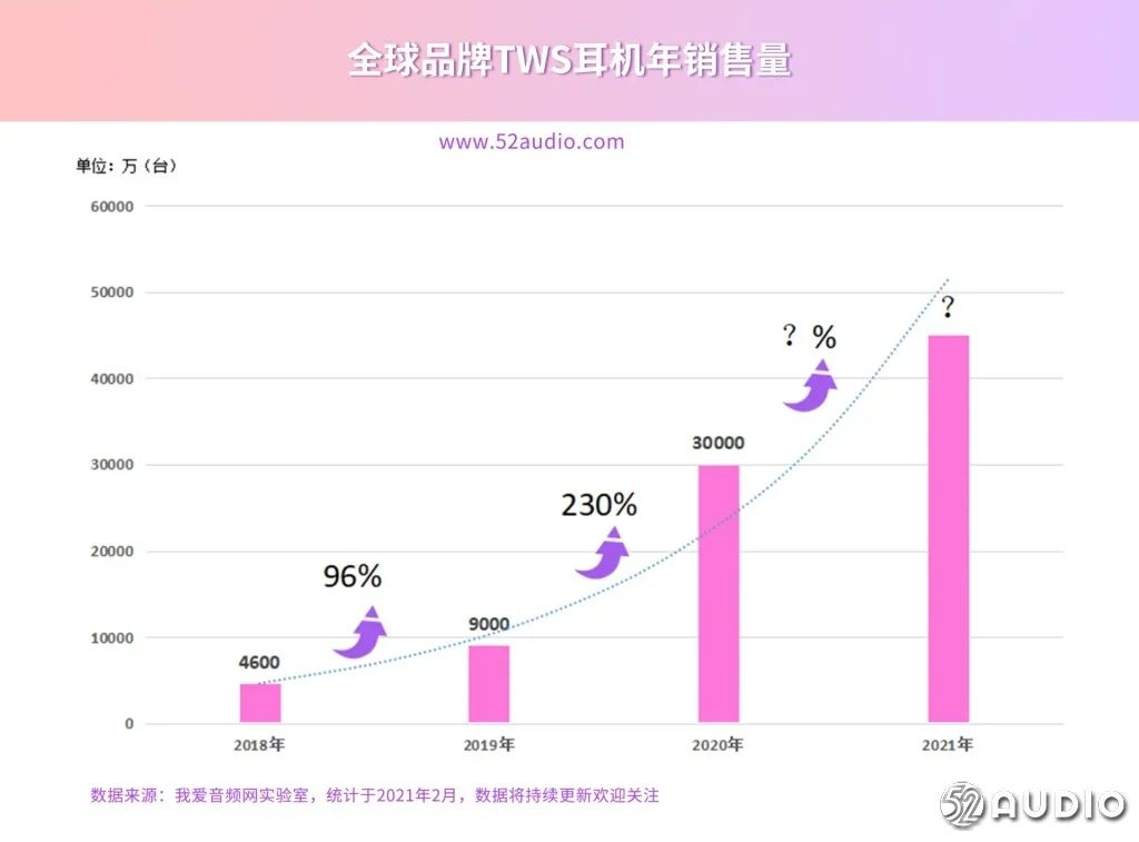 我爱音频网数据库显示,近4年来全球范围内,品牌真无线耳机在2018年的销量是4600万台,2019年销量9000万台,相较于2018年销量增长了96%。而在困难的2020年,品牌TWS耳机销量增长趋势不减,达到了3亿台,同比增长230%。