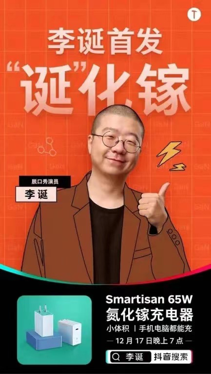 12月17日晚Smartisan与脱口秀演员李诞合作,在抖音直播代言Smartisan 氮化镓充电器。在大功率快充市场到来之时,不少手机品牌亦纷纷推出氮化镓充电器,Smartisan也终于加入这个大家庭,并且带来了惊人的65W快充高功率密度产品。而在宣传创意方面,人名跟黑科技名称做了双重关联,李诞首发“诞”化镓这条slogan也恰到好处。
