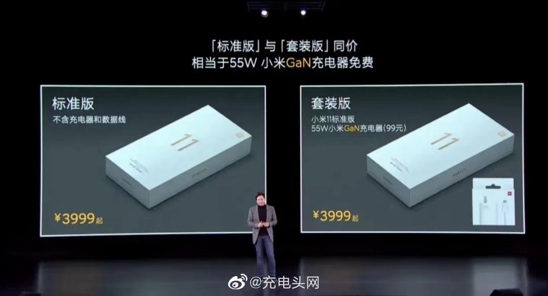2020年12月28日,在小米11发布会当天,雷军竟然一个反杀让所有人都措手不及,小米11标准版售价3999元,配送一个55W氮化镓充电器的套装版小米11同样为3999售价,让用户自行选择要不要充电器,可谓是赚足了眼球与口碑,也让这个新登场的充电器成为风暴中心。