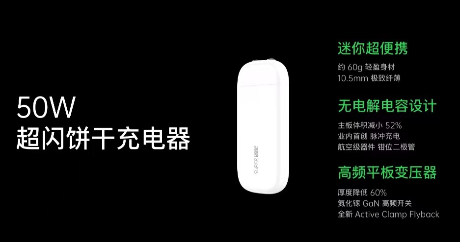 2020年7月15日,OPPO在上海正式举办了“不止于快,OPPO新一代超级闪充发布会”,闪充之父张加亮为大家带来了新一代50W超闪饼干充电器格外吸引眼球。这款充电器在体积上仅有饼干大小,是全球首款首创脉冲充电的充电器,内部创新性的取消了输入端的电解电容,由整流后的100Hz脉动直流配合ACF电路工作,可以使充电进行得更加顺利,速度快温差小,延长电池寿命等。