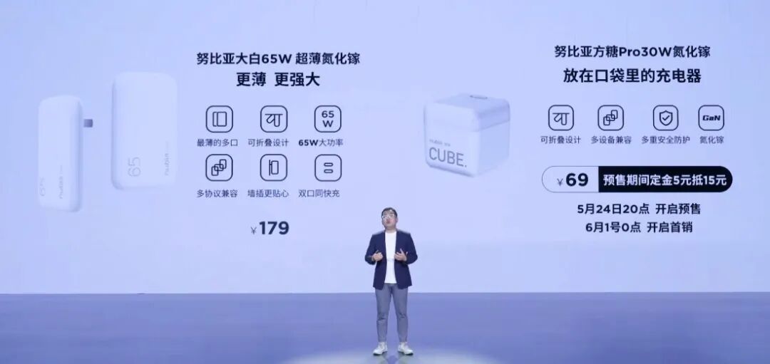 除超大功率的120W氮化镓充电器外,还有努比亚大白65W超薄氮化镓充电器,采用扁平型外观设计,超薄多口高密度,支持双口同时输出,定价179元。另有迷你充杀手之称的努比亚方糖Pro 30W氮化镓充电器,比市场火爆的20W迷你充功率更高,定价69元,5月24日20点将开启预售,预售期间定金5元抵扣15元,6月1日首销。