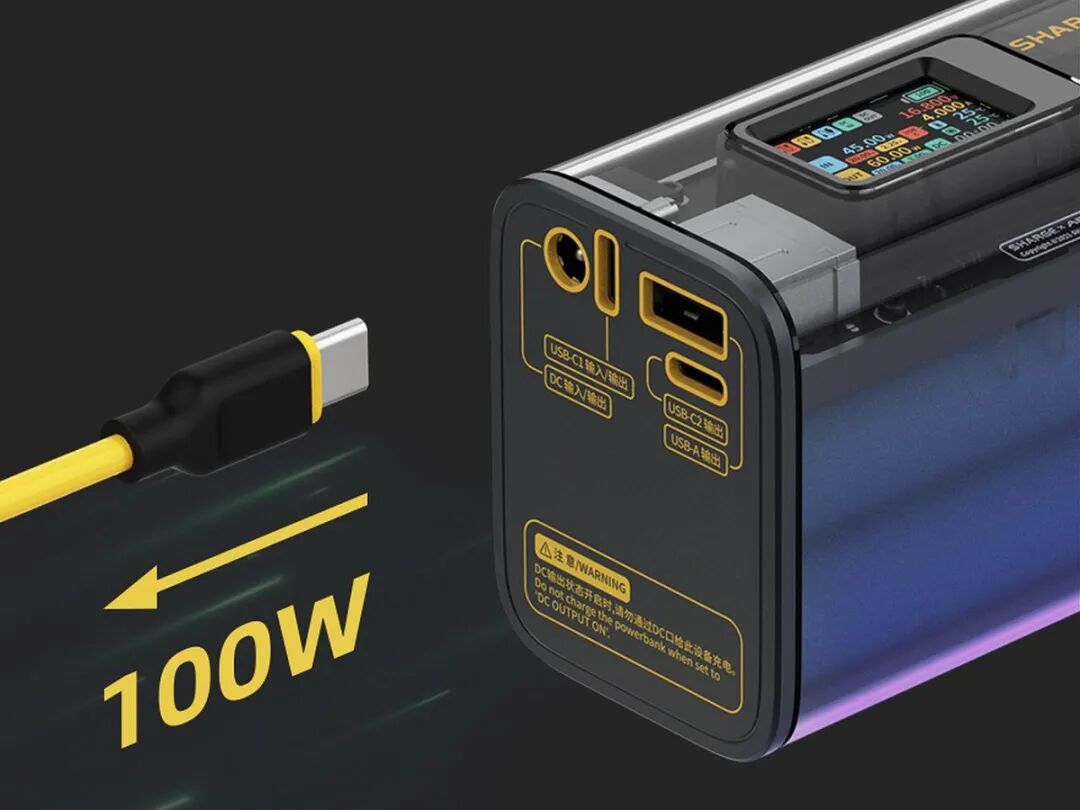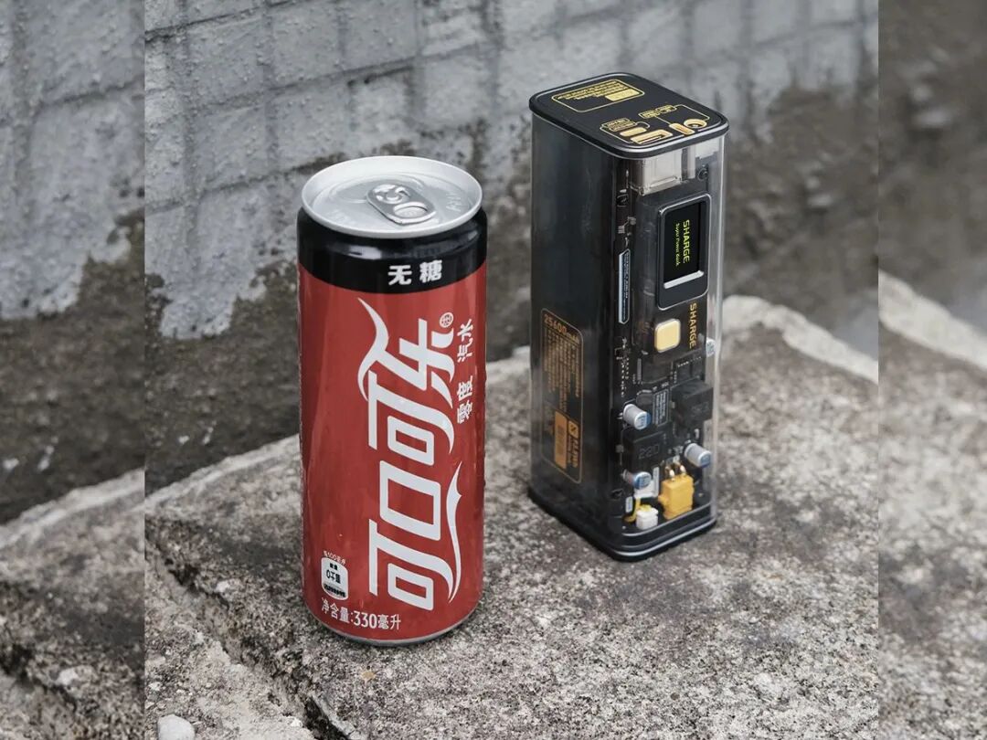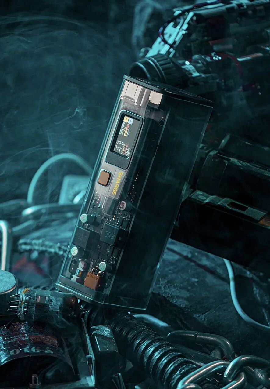 闪极超级移动电源条形透明壳体的外形设计,使内部的PCB、芯片、电池清晰可见,整体设计充满赛博朋克风格。壳体正面搭载了一块多功能IPS全彩显示屏,旁边的黄色按钮可进行功能切换以及设置和调整移动电源参数。