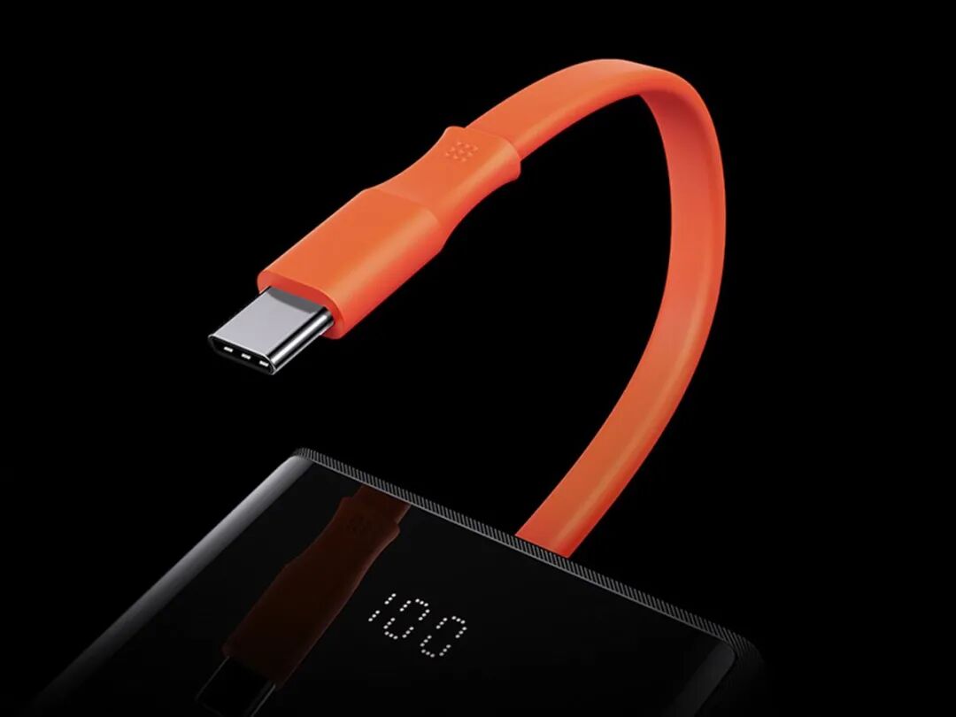 倍思精灵带线数显快充移动电源最大的特色在于其集成了一根USB-C数据线,橘红色的TPE线缆外皮柔韧抗弯折,支持65W大功率快充输出。另外该线材还可以直接插入充电器,对移动电源进行65W大功率自充。