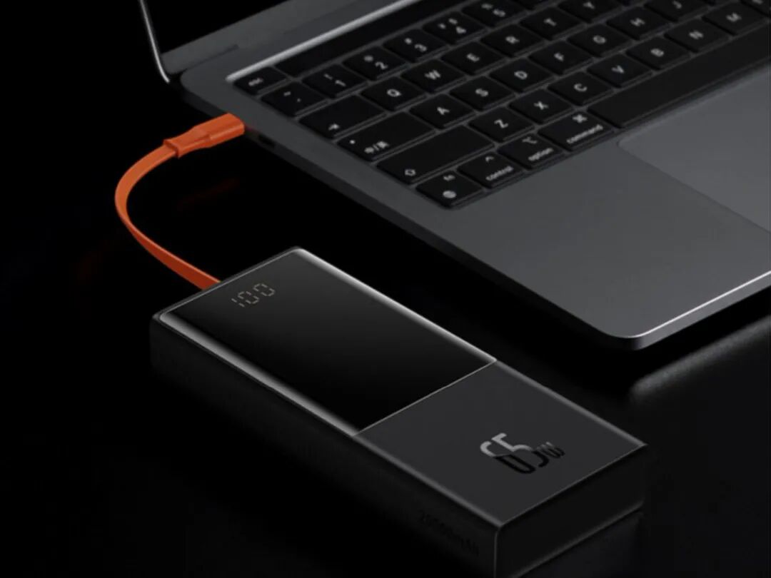 倍思精灵带线数显快充移动电源不管是USB-C接口,还是自带的USB-C线,都支持65W大功率输出,很好地适配笔记本快充需求,为主流超极本提供满血快充的电力补给,保障处理器全速运行不掉速。