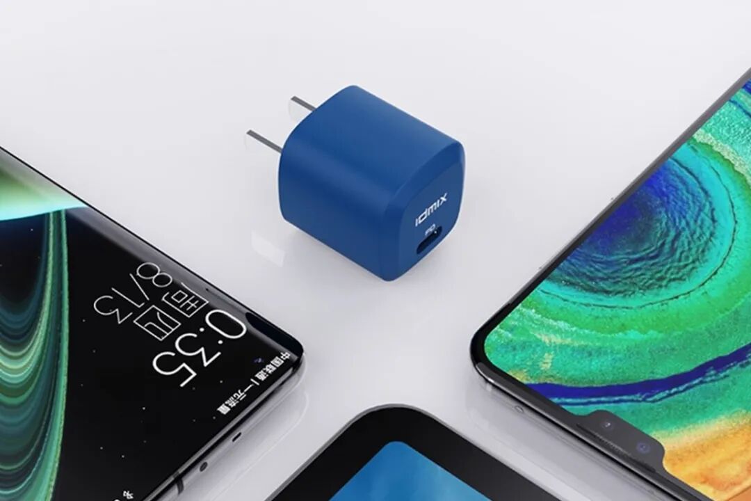 IDMIX 20W PD充电器采用了圆润的方形外观设计,表面消光工艺处理,共有海军蓝、纯白双色可选,单USB-C接口配置,具备5V3A、9V2.22A、12V1.67A三组固定电压档位。接口面板上采用了倒角设计,看上去更显质感。固定国标插脚设计,三围尺寸仅有30mm * 28.7mm * 28.7mm,功率密度0.82W/cm³。