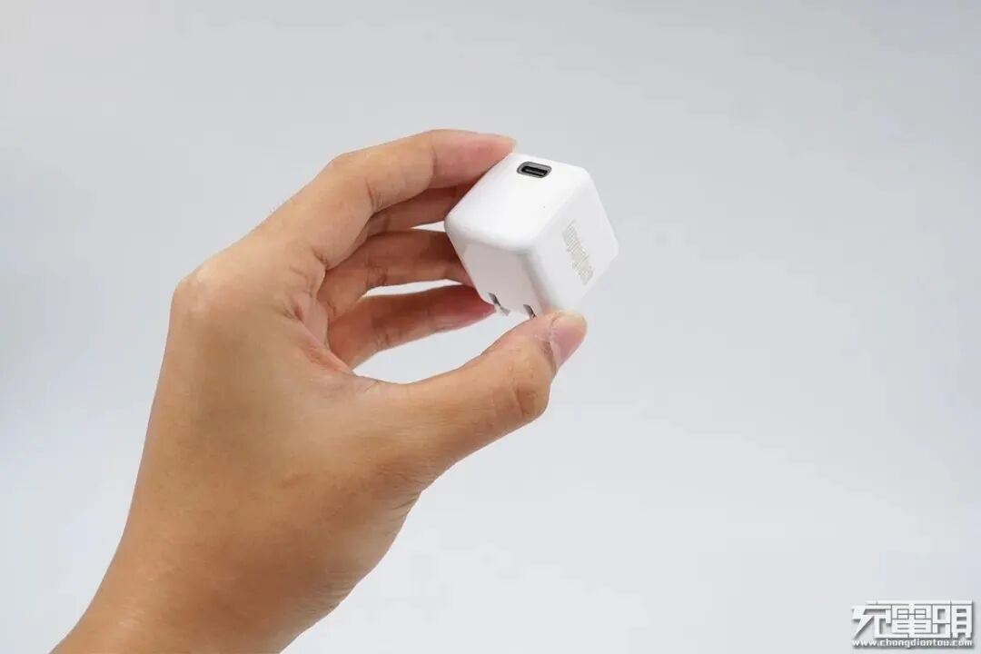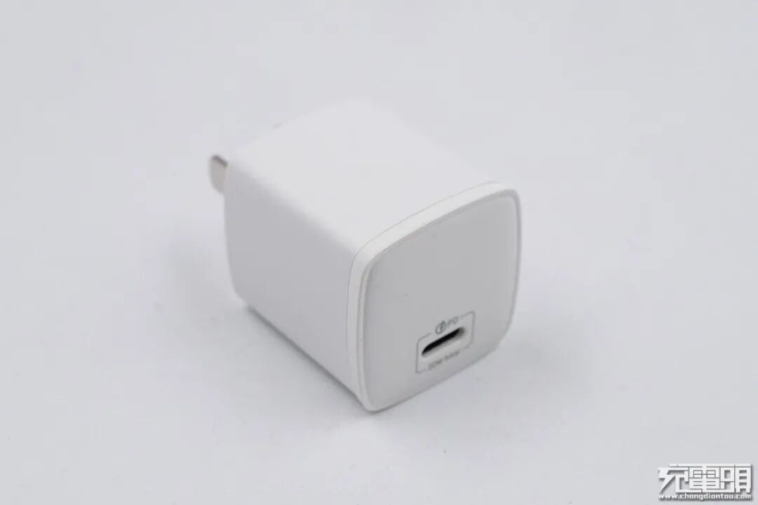 充电器以白色为主,可以看到并非规则形体,而是可以看到侧面的微微弧度,边缘处经过处理,整体手感不错,单USB-C口配置,输出面板印有“PD”、“20W Max”,具备5V3A、9V2.22A、12V1.67A三组固定电压档位。固定插脚设计,三围尺寸33.79mm * 30.17mm * 30.19mm,功率密度0.65W/cm³ 。
