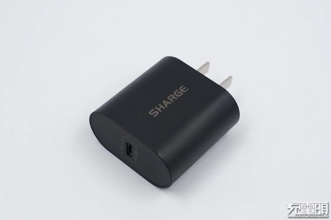 闪极20W充电器采用圆边直面板设计,黑色表面哑光处理,两脚固定插脚。正面印有”SHARGE“的logo。输出顶面中心配有一个USB-C口,黑色胶芯。有一圈标识圈着C口,分别有“PD3.0”和“20W”,具备5V3A、9V2.22A和12V1.66A三组固定电压档位,以及3.3-5.9V/3A和3.3-11V/2A两组PPS电压档位。