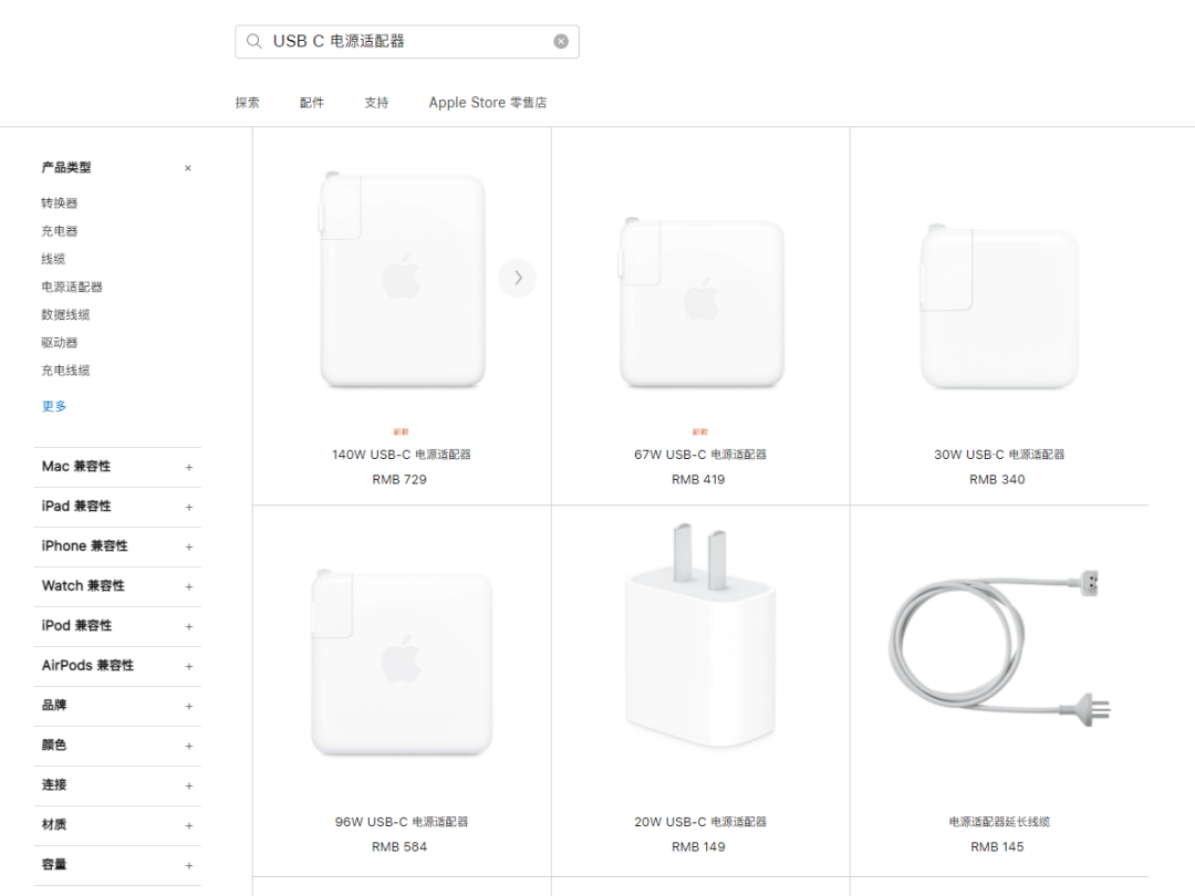 在苹果中国官网中搜索USB-C电源适配器发现,Macbook Pro 2021所配备的新款140W、67W USB-C PD快速充电器已经上架开售,目前苹果官网在售的USB-C PD快速充电器共有140W、96W、67W、30W、20W,而61W、18W已经下架不再销售。