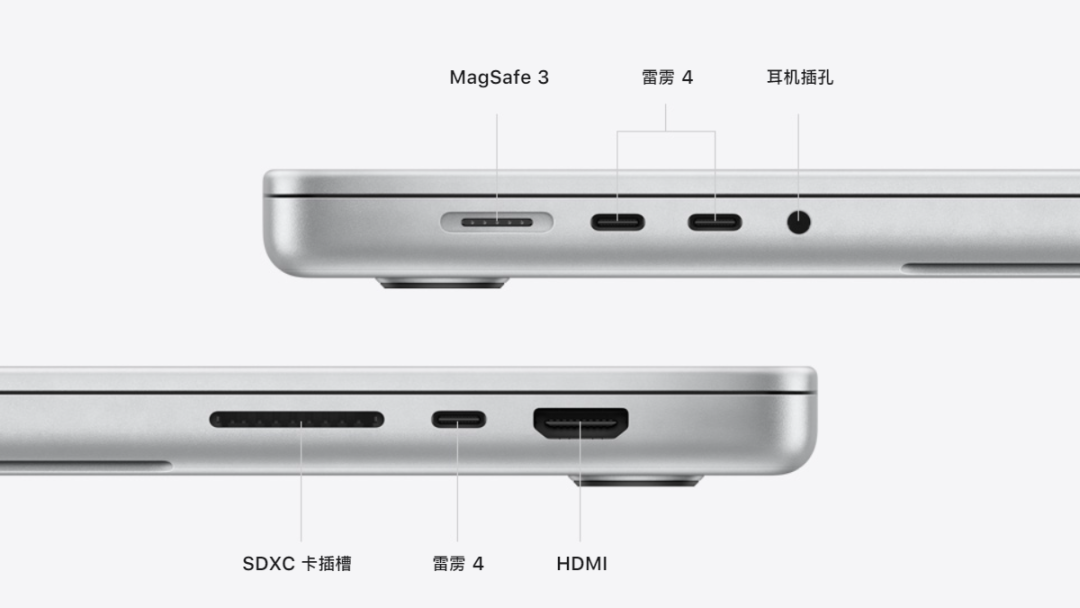 Macbook Pro 2021机身上设置了三个全功能雷电4接口,物理形态为USB-C,三个接口均支持40Gbps数据传输、6K@60Hz视频传输、96W PD快速充电,而且还兼容USB4标准,通用性极高。另外还带有HDMI视频输出口、SDXC读卡器、3.5mm耳麦接口,泪流满脸。