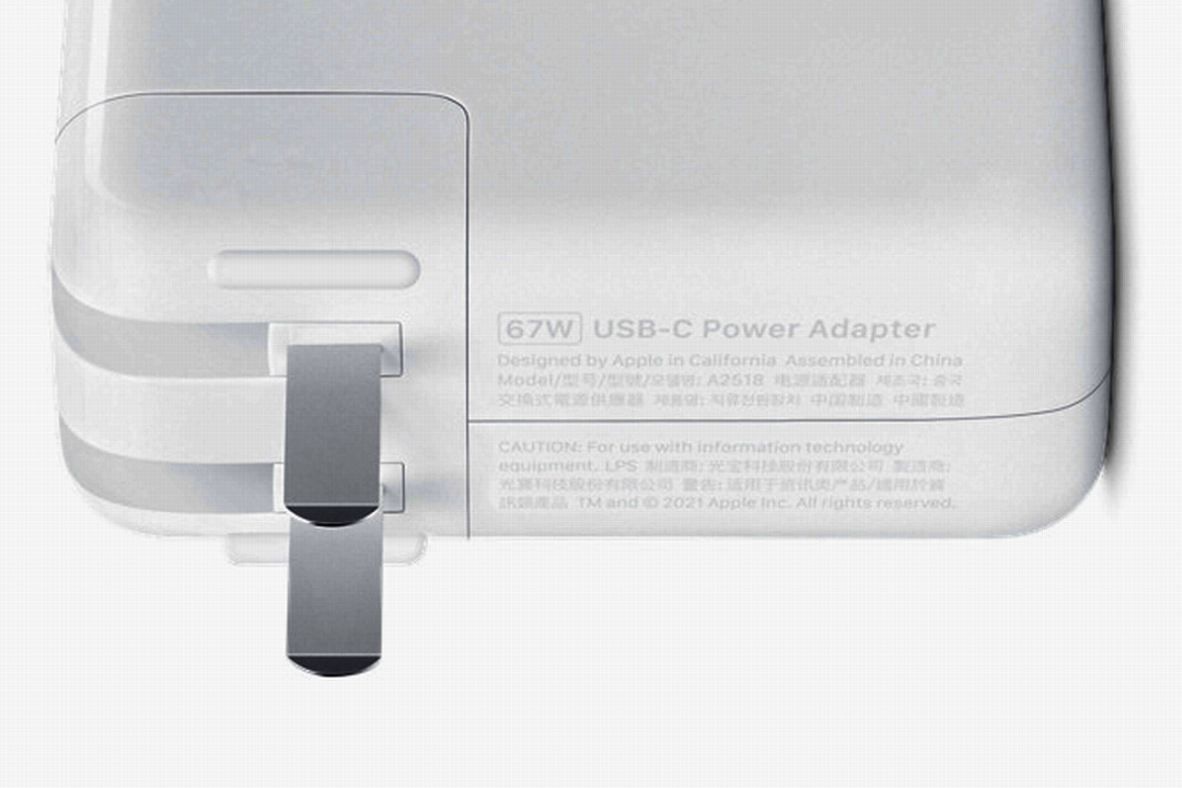 苹果67W USB-C电源适配器为单USB-C输出配置,接口为白色胶边框与96W工艺相同,壳体左右合盖处理,插脚为苹果两脚折叠插脚,可拔出替换成其他国家地区类型的插脚,整体上保持统一的设计风格。