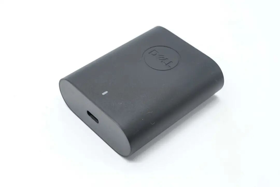 接口配置方面,戴尔60W PD充电器为单USB-C输出口配置,接口输出面板为亮面工艺,母座处于居中放置,黑色舌芯。