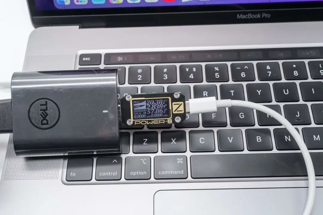 实测对Macbook Pro充电,功率达到20.38V 2.83A 57.86W,成功握手USB PD快速充电,协商电压20V PDO,并达到充电器最大输出功率值。