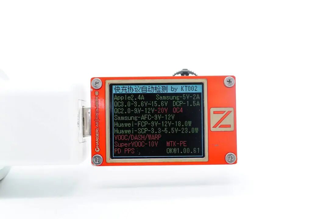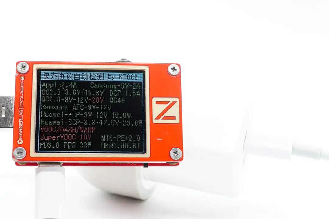 使用 ChargerLAB 的 POWER-Z KT002 读取充电器 USB-A 接口的快充协议,实测支持 Apple2.4A、QC2.0、QC3.0、AFC、FCP、SCP 等充电协议。