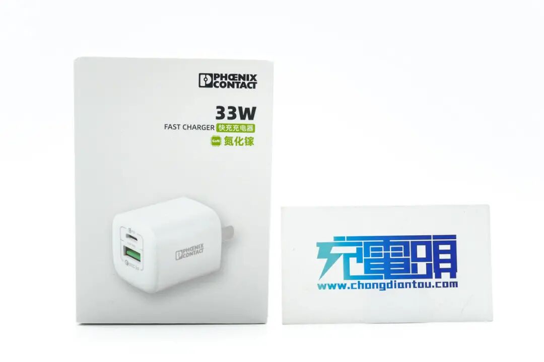 菲速33W氮化镓充电器的包装相当简洁,右上角菲尼克斯的标志 PHOENIX CONTACT 表明真身。