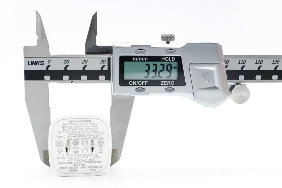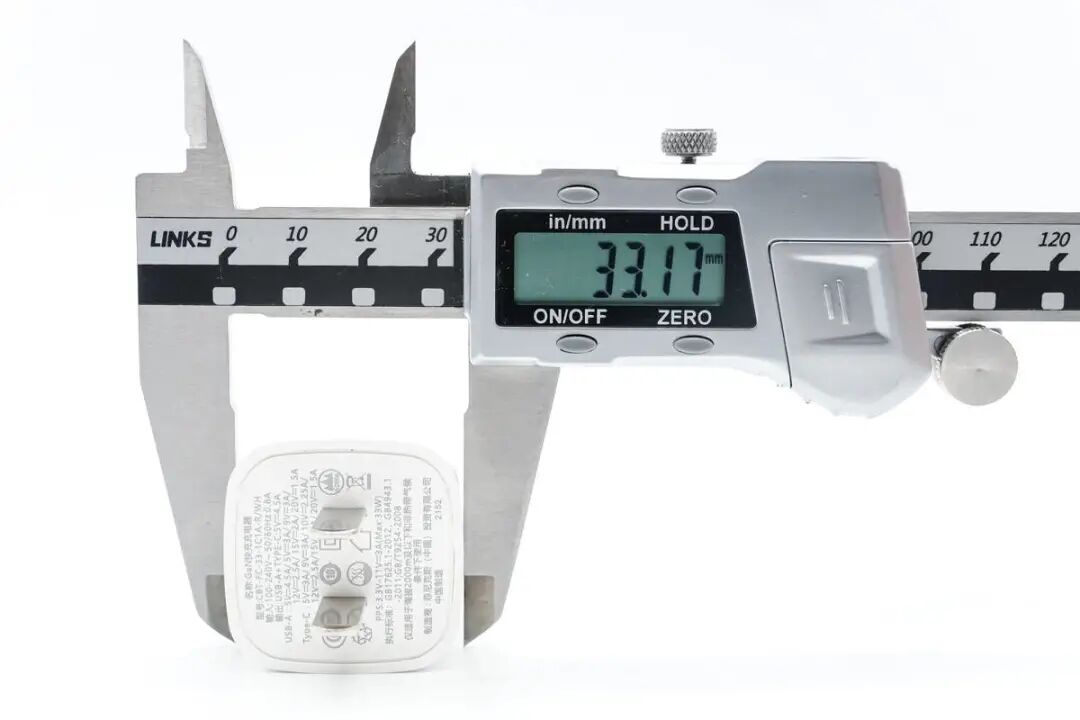 充电器的宽度约为33.29mm,充电器的尺寸约为 37.74×33.17×33.29mm,充电器的体积约为41.67cm³,按充电器的最大功率33W计算,充电器的功率密度约为 0.79W/cm³。