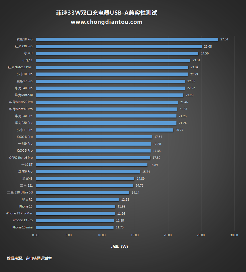 将充电功率从高到低排序,制成柱状图方便大家直观的比较不同设备间充电功率的差别。
