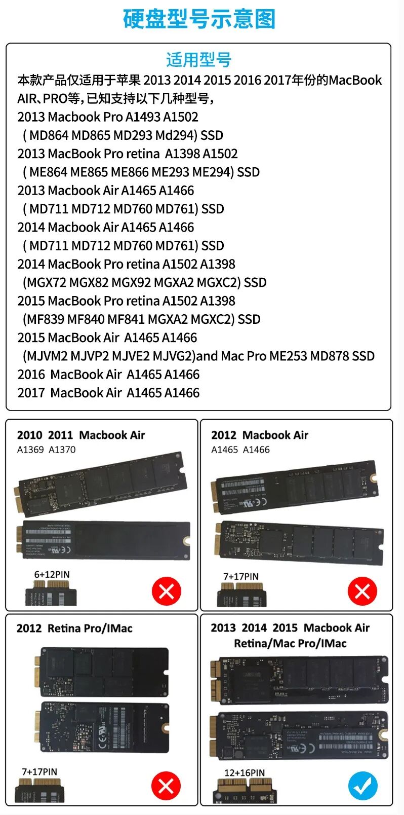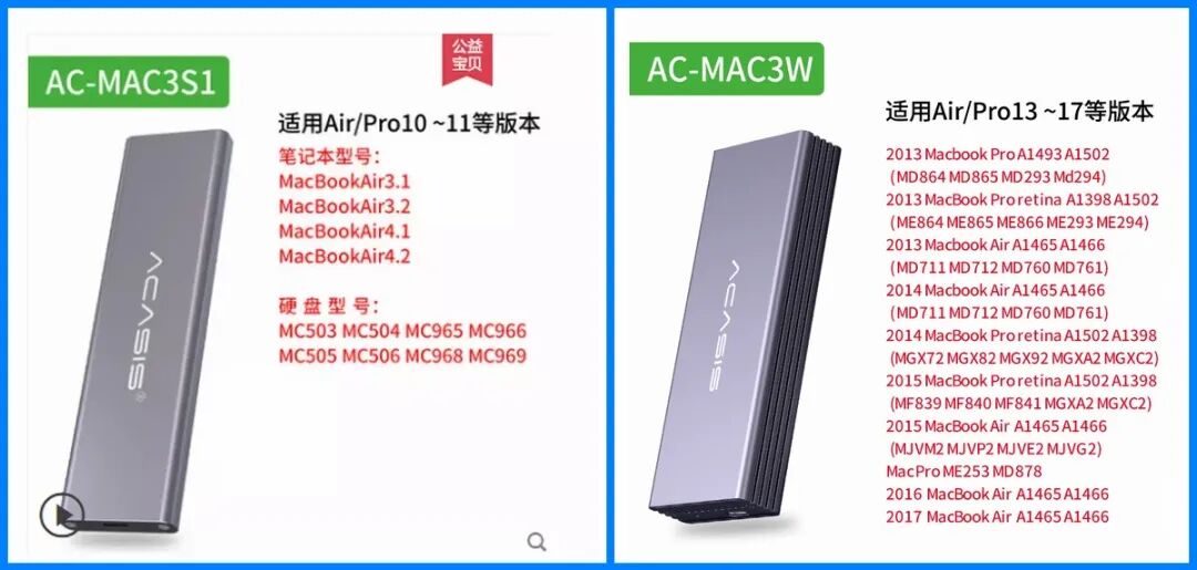 因苹果固态硬盘采用特殊接口,且针脚Pin数类型众多,阿卡西斯苹果盘移动硬盘盒这次推出两款型号,AC-MAC3W、AC-MAC3S1,支持 12+16pin 针脚的苹果固态硬盘,覆盖了 2013-2017 年多款 Macbook 机型。