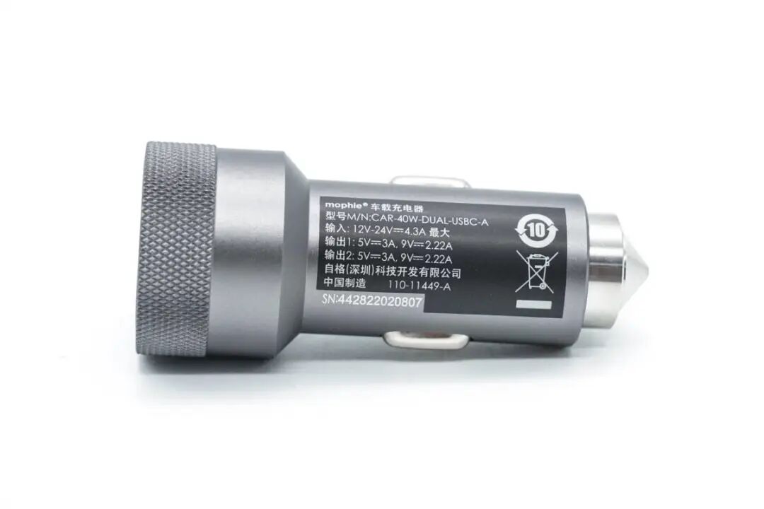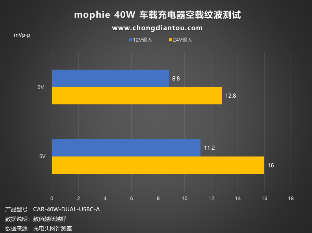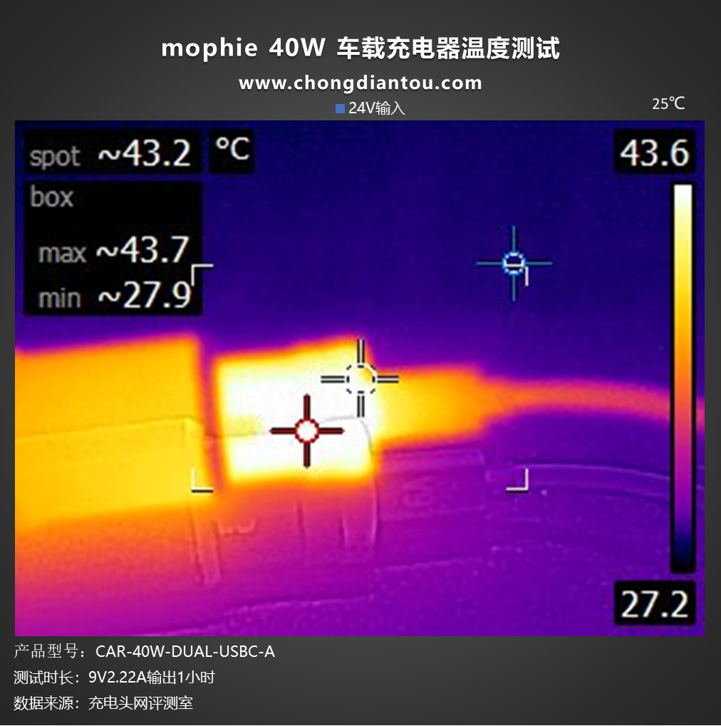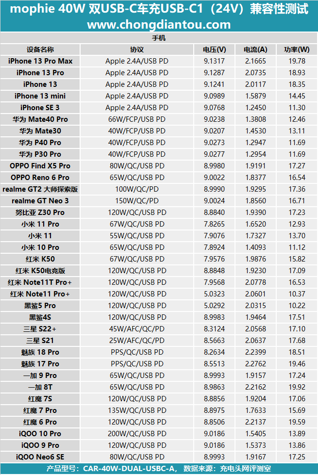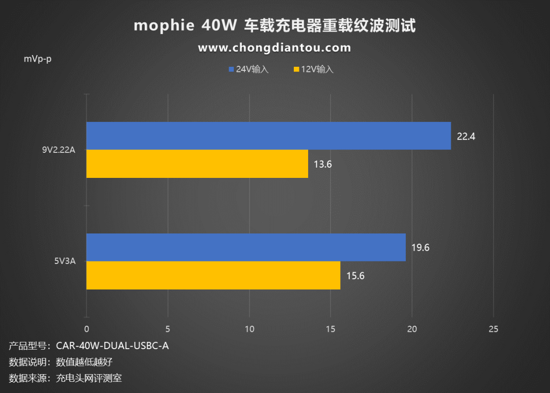 上期,充电头网已经对 mophie 的其中一款 32W 车载充电器进行评测,其性能表现优异,在满足多设备的充电需求的同时,兼顾颜值;而今天带来的这款车载充电器同样是来自 mophie,依旧秉承简约的设计风格,并且采用双USB-C端口设计,功率提升到40W;下面就一起看看车载充电器性能表现是否依旧能满足有车一族的充电需求吧。包装盒与上款32W车充拥有相同的设计风格,正面印有车充外观图,上方为 mophie 品牌Logo,下方为车载充电器名称字样,并标注拥有双USB-C充电端口,充电功率皆为20W,最高40W输出功率。打开包装,除车载充电器外,另附赠说明书、保修卡一体式手册。mophie 40W 双USB-C端口车载充电器整体采用雾面铝合金外壳设计,插入端前后两侧的双金属弹性触点设计兼容主流点烟口,与输出底端楔形过渡,造型类似于航空火箭;正面仅镭刻 mophie 品牌Logo,简约大气。USB-C1/C2输出:5V3A,9V2.22A;车充头部采用冲压工艺形成11排凸齿,除增加插拔力外,同时提升整体速度感。车充输出面板配置双US-C端口,均采用黑色母口胶芯设计,并印有 mophie 名称字样;中间圆孔为LED灯显示区域。通电后,可看到中间圆形LED灯显示颜色为水蓝色,柔光不刺眼。mophie 40W 双USB-C端口车载充电器长度约为68.68mm。mophie 40W 双USB-C端口车载充电器输出面板直径约为28.17mm。mophie 40W 双USB-C端口车载充电器重量约为40.5g,与第五套1元硬币6.1g重量相比,约为7枚硬币重量。放在成年男性手掌中对比,观感精致小巧,金属特有质感。车载充电器最高仅可支持9V电压档位输出,这里采用12V电压对车充接口的快充协议进行测试,另外实测时发现,两个USB-C端口显示一致,因此只阐述其一,不过多赘述。使用 POWER-Z KM002C测得上方USB-C端口支持PD3.0、QC4和PPS等快充协议。PDO报文方面,USB-C端口支持5V3A、9V2.22A两组固定电压档位,以及3.3-11V2A一组PPS电压档位。接下来就带大家看一看这款车载充电器的具体使用体验。充电头网会从充电兼容性测试、充电全程测试、纹波测试、温度测试等方面带大家全方位了解这款车载充电器。首先,让我们来看下这款墨菲车充USB-C接口的兼容性表现。这款墨菲车充USB-C支持20W快充,在24V输入电压下,使用车充为iPhone 13 Pro Max充电,功率为9.15V 2.16A 19.79W,可以满足iPhone 13 Pro Max的快充需求。使用车充为iPad Air 5充电,功率为9.16V 2.13A 19.52W。得益于USB PD快充与USB-C物理接口的大范围普及,这股风同样也吹到了电动工具上面,充电头网入手的这台米家手枪钻就配备了USB-C的充电接口,并支持USB PD快充协议,使用USB-C为米家手枪钻充电,功率为5.09V 0.45A 2.27W。将兼容性测试数据汇总,可以看出这款墨菲车充(型号:CAR-40W-DUAL-USBC-A)在24V输入电压下,USB-C支持大部分设备在9V 2.22A的20W档位充电。柱状图部分,由于20W不高的功率上限,各设备的充电功率相差不大。这款墨菲车充USB-C支持20W快充,在12V输入电压下,使用车充为iPhone 13 Pro Max充电,功率为9.17V 2.16A 19.85W,可以满足iPhone 13 Pro Max的快充需求。使用车充为iPad Air 5充电,功率为9.17V 2.08A 19.11W。得益于USB PD快充与USB-C物理接口的大范围普及,这股风同样也吹到了电动工具上面,充电头网入手的这台米家手枪钻就配备了USB-C的充电接口,并支持USB PD快充协议,使用USB-C为米家手枪钻充电,功率为5.08V 0.50A 2.54W。将兼容性测试数据汇总,可以看出这款墨菲车充(型号:CAR-40W-DUAL-USBC-A)在12V输入电压下USB-C同样支持大部分设备在9V 2.22A的20W档位充电。墨菲的这款车充配备双C接口,USB-C在独立输出时支持20W快充,但在多口同时输出时功率的具体分配情况,还需要实际测试一下。在24V电压下,使用车充USB-C为iPhone 13 Pro Max充电,功率为9.14V 2.16A 19.78W;同时使用车充USB-A为红米 K50电竞版充电,功率为8.69V 1.93A 16.74W。在12V电压下,使用车充USB-C为iPhone 13 Pro Max充电,功率为9.16V 2.16A 19.80W;同时使用车充USB-A为红米 K50电竞版充电,功率为8.71V 1.93A 16.78W。实测这款墨菲车充双C接口同时输出可以满足两台手机的快充需求,功率按照20W+20W的规则分配。mophie的这款车充两个USB-C端口均支持20W快充,所以此次选择为iPhone 13 Pro 充电,以下是实测全程。这是使用USB-C端口为iPhone 13 Pro 充电全程的数据,全程耗时约1小时55分,最高功率为9.13V 2.13A 19.45W。从曲线图中可以看出车充在一定的时间内为手机充入的电量,可以看出,手机在半小时的时候充电54%,1小时充电80%,完全充满耗时约1小时55分。充电头网采用示波器测试车充输出的纹波值,与国家标准进行比对,检测车充的输出质量。纹波越低,车充的输出质量就越高。纹波测试分为空载(柱状图中Y轴电流为0A)和重载(柱状图中Y轴电流为非0A)两种。空载部分,两类车辆电压下,5V电压档位下最高分别为11.2mVp-p、16mVp-p。重载部分,24V车辆电压下处于9V2.22A输出状态时纹波最高,为22.4mVp-p;12V车辆电压下处于5V3A输出状态时纹波最低,为15.6mVp-p。下面来看一下mophie的这款车充的温控表现如何,将车充放在25℃的恒温箱中,以9V2.22A 20W的功率持续输出1小时,然后使用热成像仪拍摄表面的温度。mophie 40W车充在外观上依旧采用皓月银配色的铝制外壳,车充头部采用冲压工艺形成11排凸齿,提升整体质感;搭配双USB-C的端口配置,满足双设备充电需求;而且车充重量与7枚1元硬币相当,整体轻盈小巧。性能方面,mophie 40W车充配备USB-C端口均支持20W快充,在兼容性测试部分对于手机、平板电脑、笔记本电脑的快充支持情况不错;以充电