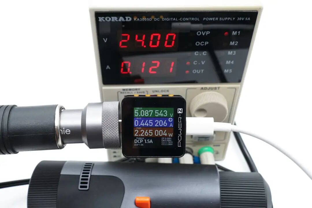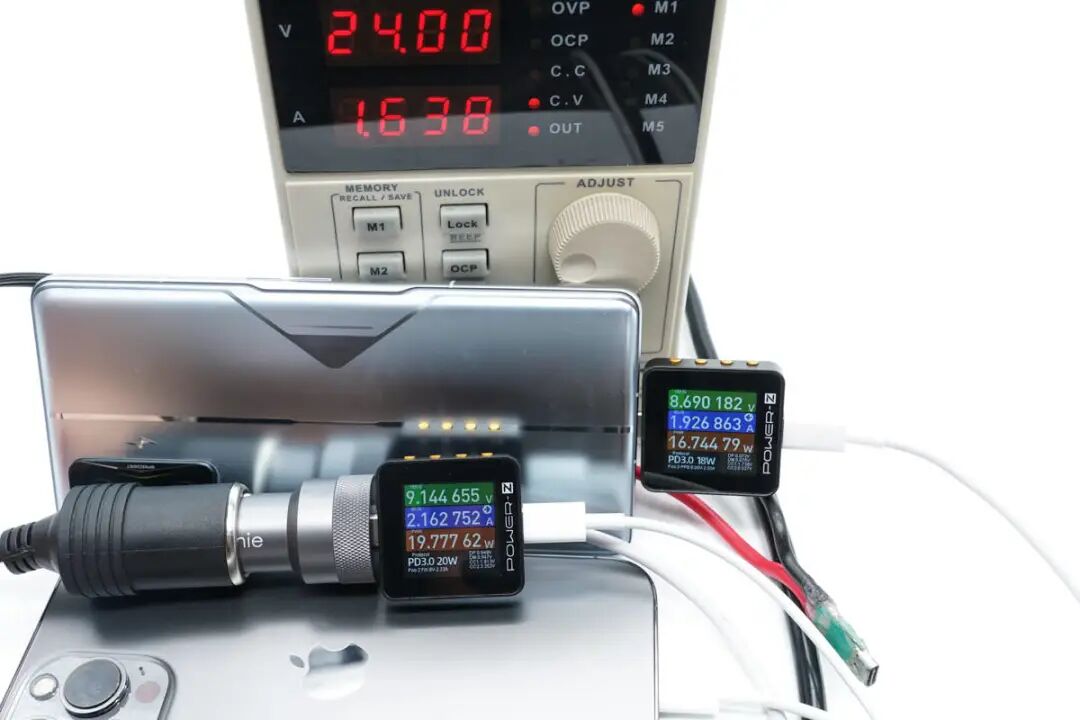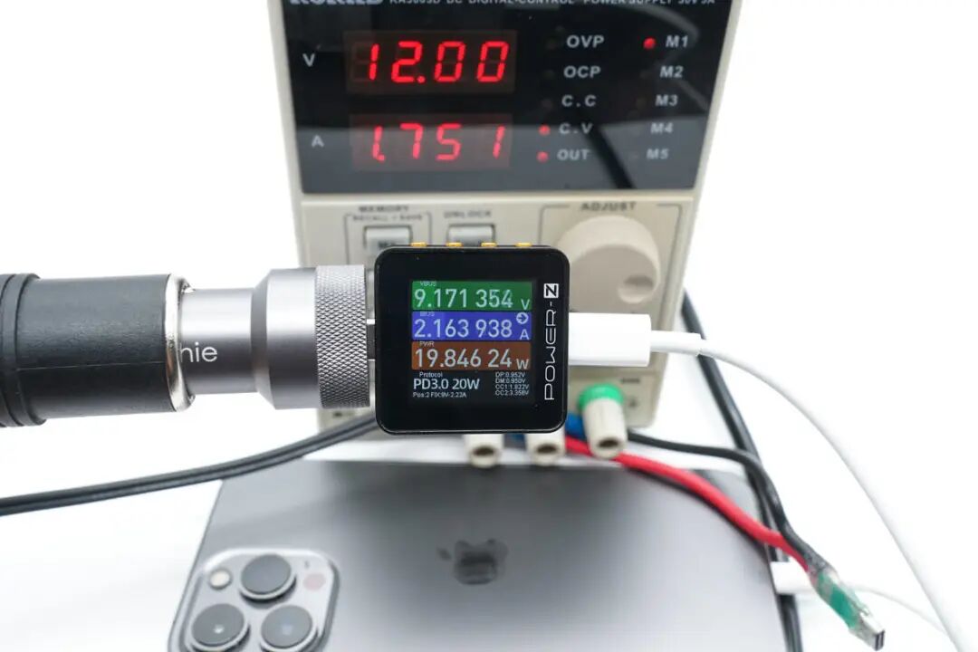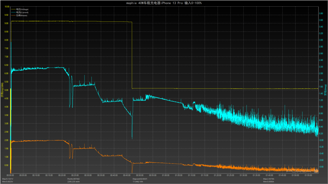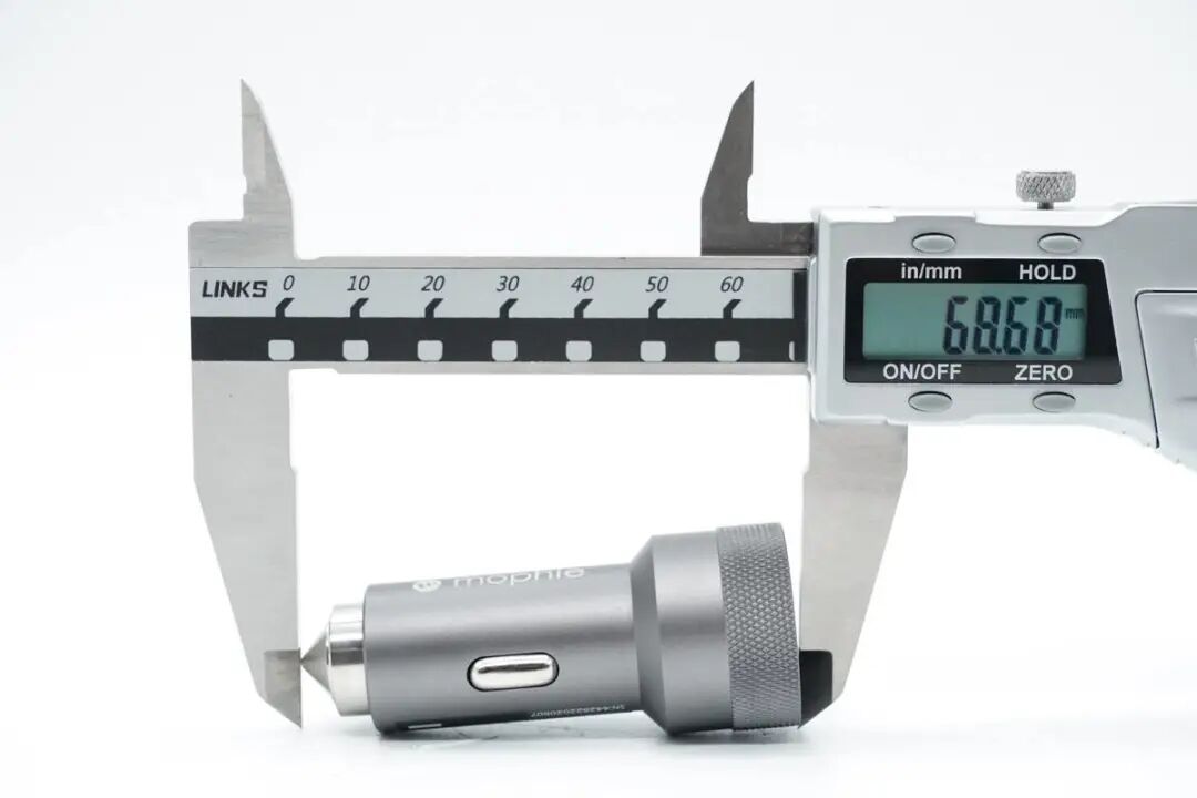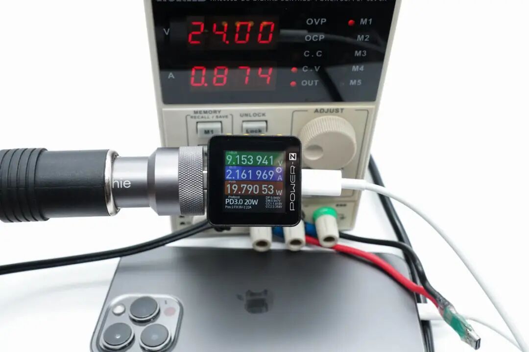 上期,充电头网已经对 mophie 的其中一款 32W 车载充电器进行评测,其性能表现优异,在满足多设备的充电需求的同时,兼顾颜值;而今天带来的这款车载充电器同样是来自 mophie,依旧秉承简约的设计风格,并且采用双USB-C端口设计,功率提升到40W;下面就一起看看车载充电器性能表现是否依旧能满足有车一族的充电需求吧。包装盒与上款32W车充拥有相同的设计风格,正面印有车充外观图,上方为 mophie 品牌Logo,下方为车载充电器名称字样,并标注拥有双USB-C充电端口,充电功率皆为20W,最高40W输出功率。打开包装,除车载充电器外,另附赠说明书、保修卡一体式手册。mophie 40W 双USB-C端口车载充电器整体采用雾面铝合金外壳设计,插入端前后两侧的双金属弹性触点设计兼容主流点烟口,与输出底端楔形过渡,造型类似于航空火箭;正面仅镭刻 mophie 品牌Logo,简约大气。USB-C1/C2输出:5V3A,9V2.22A;车充头部采用冲压工艺形成11排凸齿,除增加插拔力外,同时提升整体速度感。车充输出面板配置双US-C端口,均采用黑色母口胶芯设计,并印有 mophie 名称字样;中间圆孔为LED灯显示区域。通电后,可看到中间圆形LED灯显示颜色为水蓝色,柔光不刺眼。mophie 40W 双USB-C端口车载充电器长度约为68.68mm。mophie 40W 双USB-C端口车载充电器输出面板直径约为28.17mm。mophie 40W 双USB-C端口车载充电器重量约为40.5g,与第五套1元硬币6.1g重量相比,约为7枚硬币重量。放在成年男性手掌中对比,观感精致小巧,金属特有质感。车载充电器最高仅可支持9V电压档位输出,这里采用12V电压对车充接口的快充协议进行测试,另外实测时发现,两个USB-C端口显示一致,因此只阐述其一,不过多赘述。使用 POWER-Z KM002C测得上方USB-C端口支持PD3.0、QC4和PPS等快充协议。PDO报文方面,USB-C端口支持5V3A、9V2.22A两组固定电压档位,以及3.3-11V2A一组PPS电压档位。接下来就带大家看一看这款车载充电器的具体使用体验。充电头网会从充电兼容性测试、充电全程测试、纹波测试、温度测试等方面带大家全方位了解这款车载充电器。首先,让我们来看下这款墨菲车充USB-C接口的兼容性表现。这款墨菲车充USB-C支持20W快充,在24V输入电压下,使用车充为iPhone 13 Pro Max充电,功率为9.15V 2.16A 19.79W,可以满足iPhone 13 Pro Max的快充需求。使用车充为iPad Air 5充电,功率为9.16V 2.13A 19.52W。得益于USB PD快充与USB-C物理接口的大范围普及,这股风同样也吹到了电动工具上面,充电头网入手的这台米家手枪钻就配备了USB-C的充电接口,并支持USB PD快充协议,使用USB-C为米家手枪钻充电,功率为5.09V 0.45A 2.27W。将兼容性测试数据汇总,可以看出这款墨菲车充(型号:CAR-40W-DUAL-USBC-A)在24V输入电压下,USB-C支持大部分设备在9V 2.22A的20W档位充电。柱状图部分,由于20W不高的功率上限,各设备的充电功率相差不大。这款墨菲车充USB-C支持20W快充,在12V输入电压下,使用车充为iPhone 13 Pro Max充电,功率为9.17V 2.16A 19.85W,可以满足iPhone 13 Pro Max的快充需求。使用车充为iPad Air 5充电,功率为9.17V 2.08A 19.11W。得益于USB PD快充与USB-C物理接口的大范围普及,这股风同样也吹到了电动工具上面,充电头网入手的这台米家手枪钻就配备了USB-C的充电接口,并支持USB PD快充协议,使用USB-C为米家手枪钻充电,功率为5.08V 0.50A 2.54W。将兼容性测试数据汇总,可以看出这款墨菲车充(型号:CAR-40W-DUAL-USBC-A)在12V输入电压下USB-C同样支持大部分设备在9V 2.22A的20W档位充电。墨菲的这款车充配备双C接口,USB-C在独立输出时支持20W快充,但在多口同时输出时功率的具体分配情况,还需要实际测试一下。在24V电压下,使用车充USB-C为iPhone 13 Pro Max充电,功率为9.14V 2.16A 19.78W;同时使用车充USB-A为红米 K50电竞版充电,功率为8.69V 1.93A 16.74W。在12V电压下,使用车充USB-C为iPhone 13 Pro Max充电,功率为9.16V 2.16A 19.80W;同时使用车充USB-A为红米 K50电竞版充电,功率为8.71V 1.93A 16.78W。实测这款墨菲车充双C接口同时输出可以满足两台手机的快充需求,功率按照20W+20W的规则分配。mophie的这款车充两个USB-C端口均支持20W快充,所以此次选择为iPhone 13 Pro 充电,以下是实测全程。这是使用USB-C端口为iPhone 13 Pro 充电全程的数据,全程耗时约1小时55分,最高功率为9.13V 2.13A 19.45W。从曲线图中可以看出车充在一定的时间内为手机充入的电量,可以看出,手机在半小时的时候充电54%,1小时充电80%,完全充满耗时约1小时55分。充电头网采用示波器测试车充输出的纹波值,与国家标准进行比对,检测车充的输出质量。纹波越低,车充的输出质量就越高。纹波测试分为空载(柱状图中Y轴电流为0A)和重载(柱状图中Y轴电流为非0A)两种。空载部分,两类车辆电压下,5V电压档位下最高分别为11.2mVp-p、16mVp-p。重载部分,24V车辆电压下处于9V2.22A输出状态时纹波最高,为22.4mVp-p;12V车辆电压下处于5V3A输出状态时纹波最低,为15.6mVp-p。下面来看一下mophie的这款车充的温控表现如何,将车充放在25℃的恒温箱中,以9V2.22A 20W的功率持续输出1小时,然后使用热成像仪拍摄表面的温度。mophie 40W车充在外观上依旧采用皓月银配色的铝制外壳,车充头部采用冲压工艺形成11排凸齿,提升整体质感;搭配双USB-C的端口配置,满足双设备充电需求;而且车充重量与7枚1元硬币相当,整体轻盈小巧。性能方面,mophie 40W车充配备USB-C端口均支持20W快充,在兼容性测试部分对于手机、平板电脑、笔记本电脑的快充支持情况不错;以充电