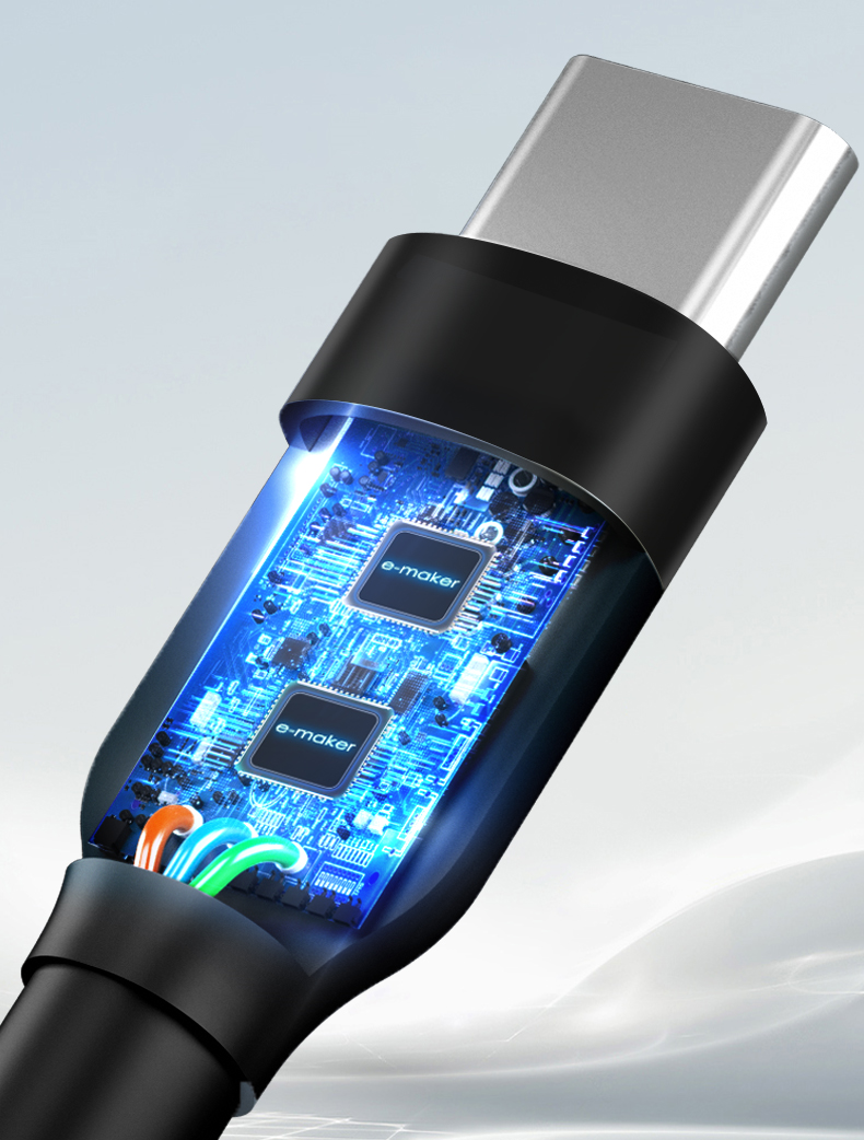 线缆端子头内使用了 E-Marker 芯片,支持 20V5A 100W 大功率电力传输。