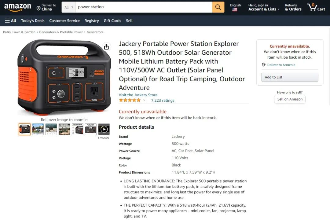 Jackery Portable Power Station Explorer 500 是排行榜里电量最大的户外电源,电池能量达到 518Wh,也是唯一超过 400Wh 电量的机型,售价为 499 美元,额定输出功率 500W,评分 4.8,评论数量 7180。