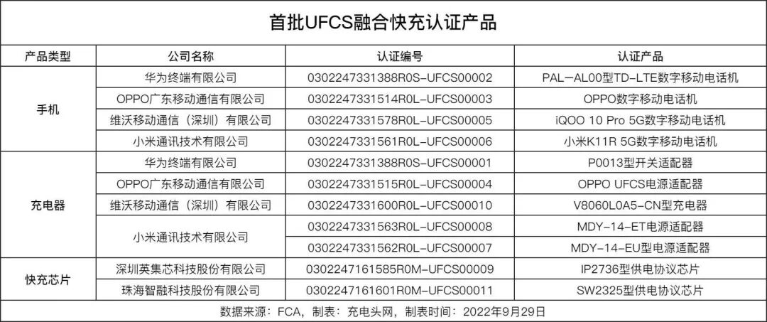 2022 年 9 月 29 日,中国通信标准化协会与电信终端产业协会联合在京召开移动终端融合快充成果发布会,发布首批 11 张快充认证证书,涉及 6 家企业的 4 款终端、5 款适配器和 2 款芯片产品。