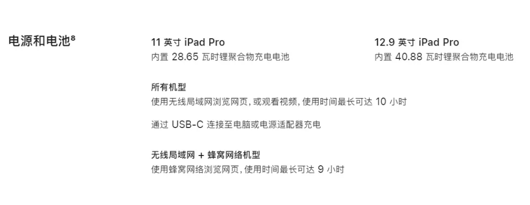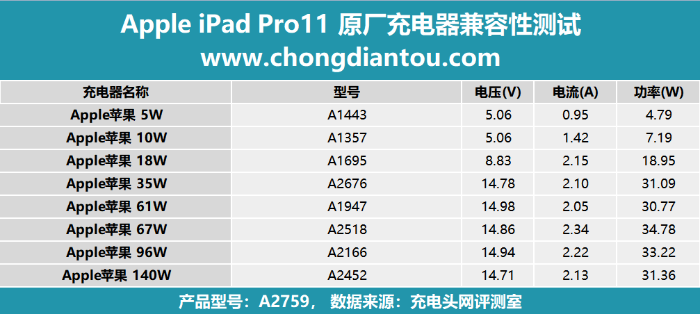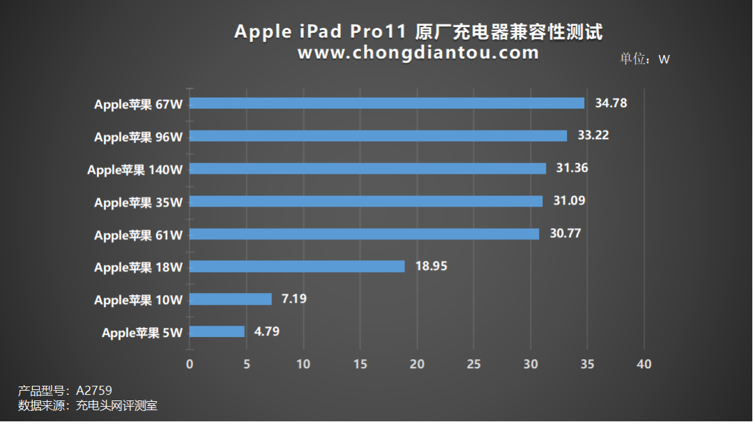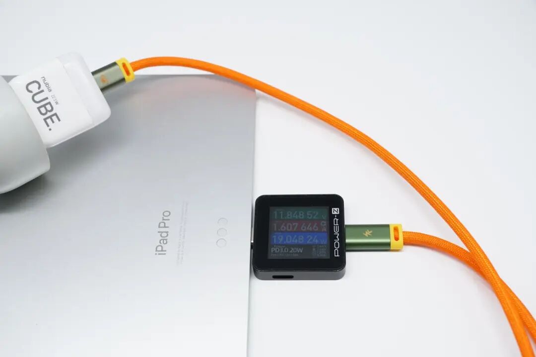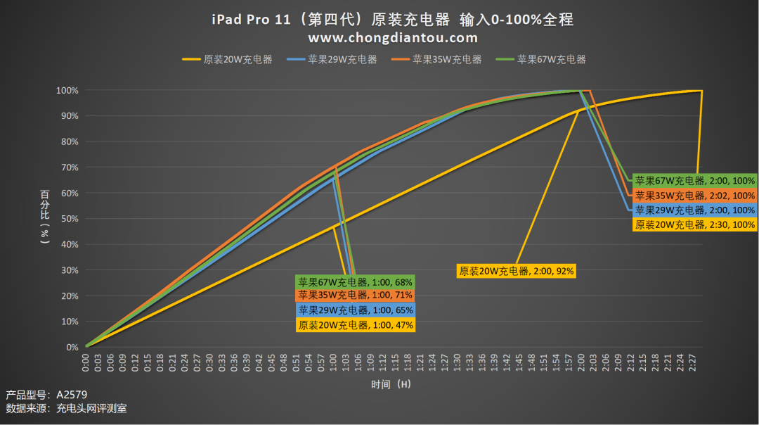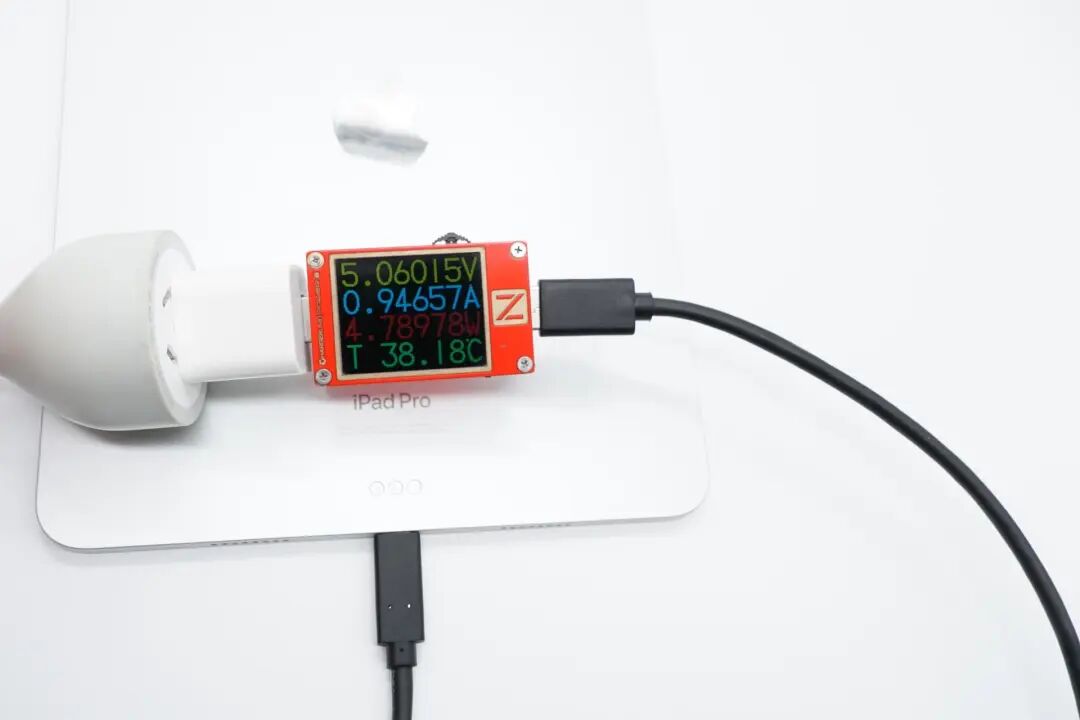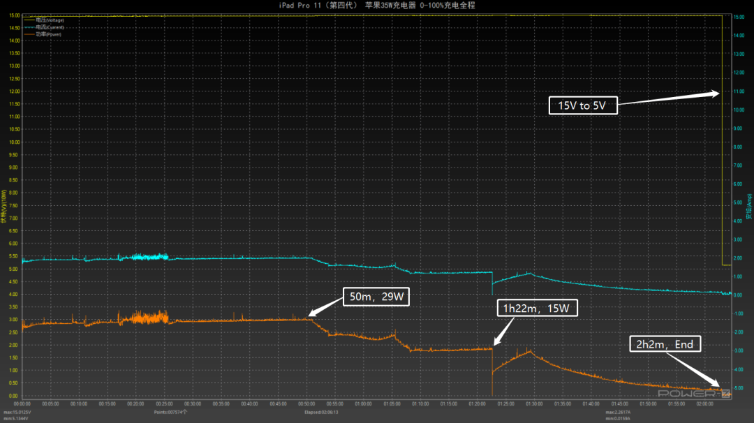 充电兼容性测试可以了解到每款充电器对于iPad的快充支持情况,但想看充电的数据变化还是需要看充电全程的测试的,下面就用苹果20W、29W、35W(A2676)以及67W充电器为iPad充电,来看充电全程的数据变化情况。这是使用原装20W充电器为iPad Pro 11(第四代)充电的全过程;接通电源后直接握手9V电压;1小时35分以前,功率稳定在19W左右;1小时36分,功率略微降低一点,在17-18W之间波动;1小时56分后,进入涓流充电直至充满,充电全程耗时2小时30分左右;最高功率8.97V 2.15A 19.32W。这是使用苹果29W充电器为iPad Pro 11(第四代)充电的全过程;接通电源后握手14.5V电压;57分以前,功率稳定在28W左右;58分钟后功率逐渐降低,并在20-27W之间波动;1小时30分后,进入涓流充电直至充满,充电全程耗时约2个小时;最高功率14.78V 1.97A 29.08W。这是使用苹果35W充电器为iPad Pro 11(第四代)充电的全过程;接通电源后握手15V电压;前50分钟,功率稳定在29W左右,期间功率偶尔可以达到33W左右;51分钟后功率开始持续下降,首先下降到23W左右并充电约10分钟左右,随后再次下降至18W左右,并持续充电至1小时22分;1小时29分进入涓流充电直至充电结束,充电全程耗时2小时2分钟左右;最高功率14.96V 2.26A 33.83W。这是使用苹果67W充电器为iPad Pro 11(第四代)充电的全过程;同样,接通电源后直接握手15V电压;前53分钟,功率稳定在30W左右;53分钟后功率开始下降,功率由30W左右逐渐下降至18W左右,过程持续约33分钟左右;1小时27分进入涓流充电直至充电结束,充电全程耗时约2个小时;最高功率15V 2.43A 36.45W。将所有充电数据汇总成折线图,可以看出,原装20W充电器充电耗时较多,其他档位的充电耗时都在2个小时左右。小结发现一个有趣的规律,测试中有三款充电器在充满电时,会握手5V电压;苹果29W比较特殊,充电结束并没有握手5V电压;想要达更快的充电速度,可以选择30W以上功率的PD充电器。